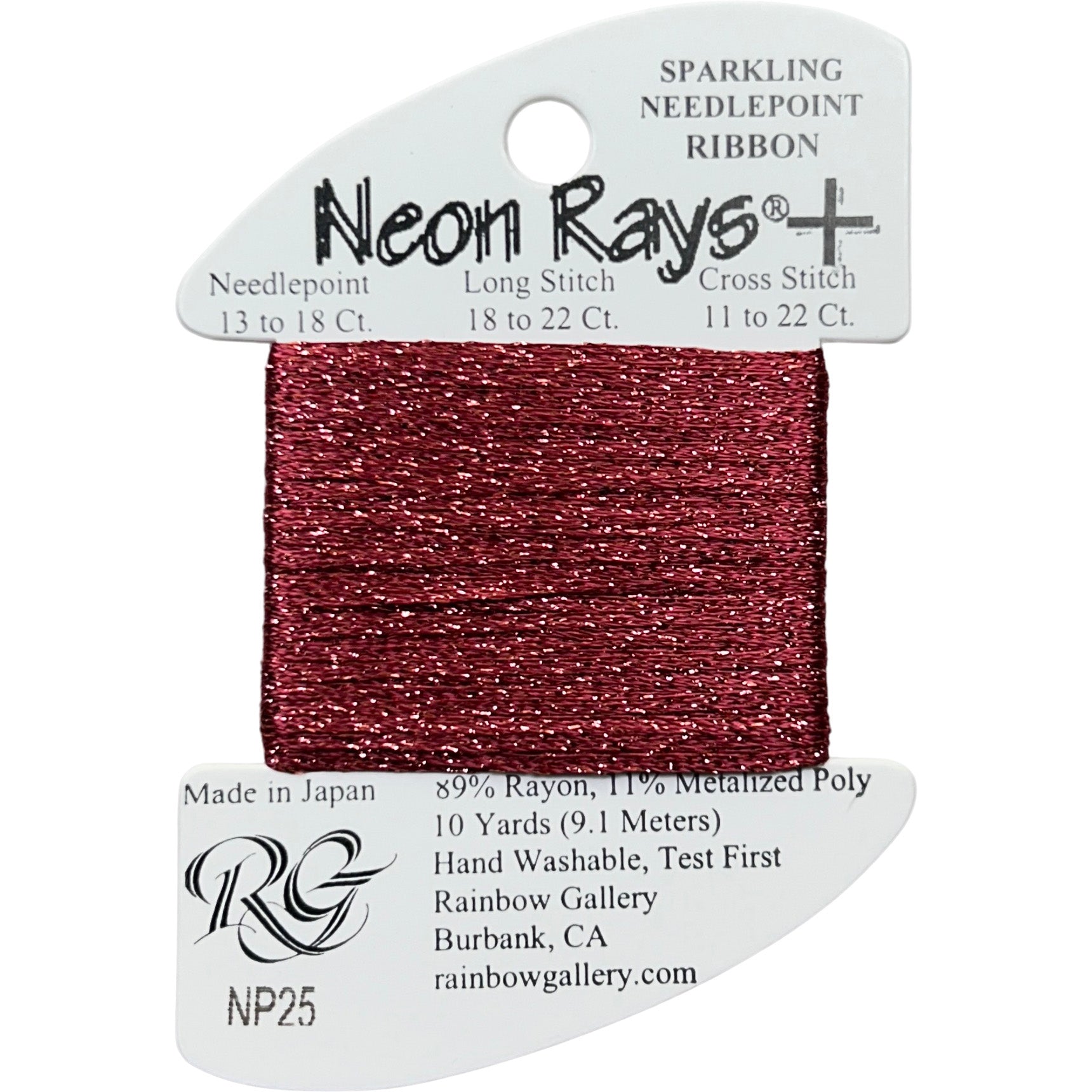 This is Neon Rays Plus from Rainbow Gallery in color 025 Brick Red. A shiny rayon ribbon with hints of sparkles that is excellent for creating metallic and porcelain textures. Works to great effect with long stitches. Use as-is on all sizes.