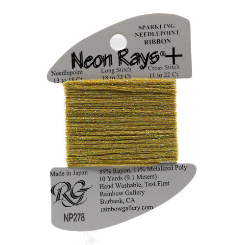 This is Neon Rays Plus from Rainbow Gallery in color 278 Buttercup. A shiny rayon ribbon with hints of sparkles that is excellent for creating metallic and porcelain textures. Works to great effect with long stitches. Use as-is on all sizes.