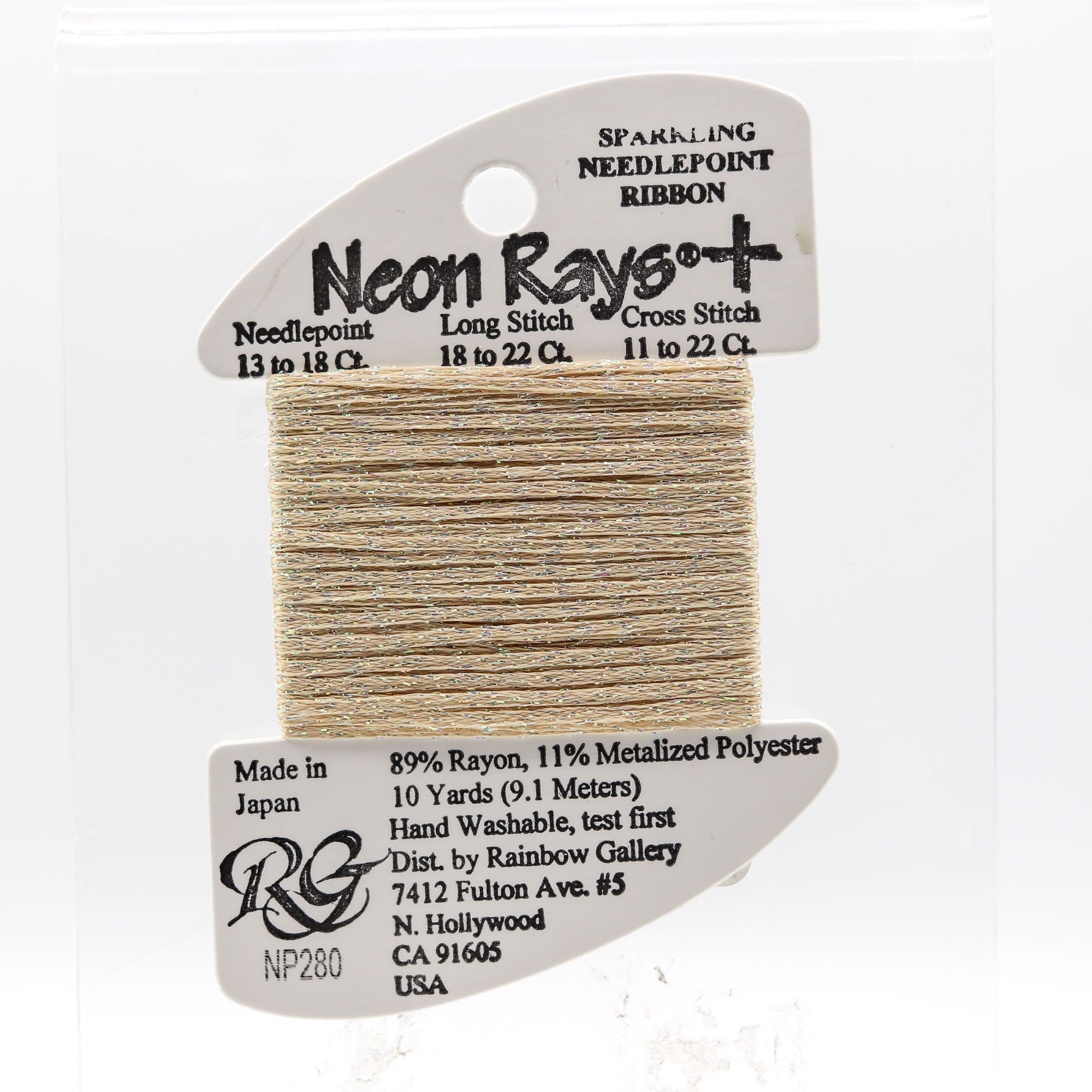 This is Neon Rays Plus from Rainbow Gallery in color 280 Sand Gold. A shiny rayon ribbon with hints of sparkles that is excellent for creating metallic and porcelain textures. Works to great effect with long stitches. Use as-is on all sizes.