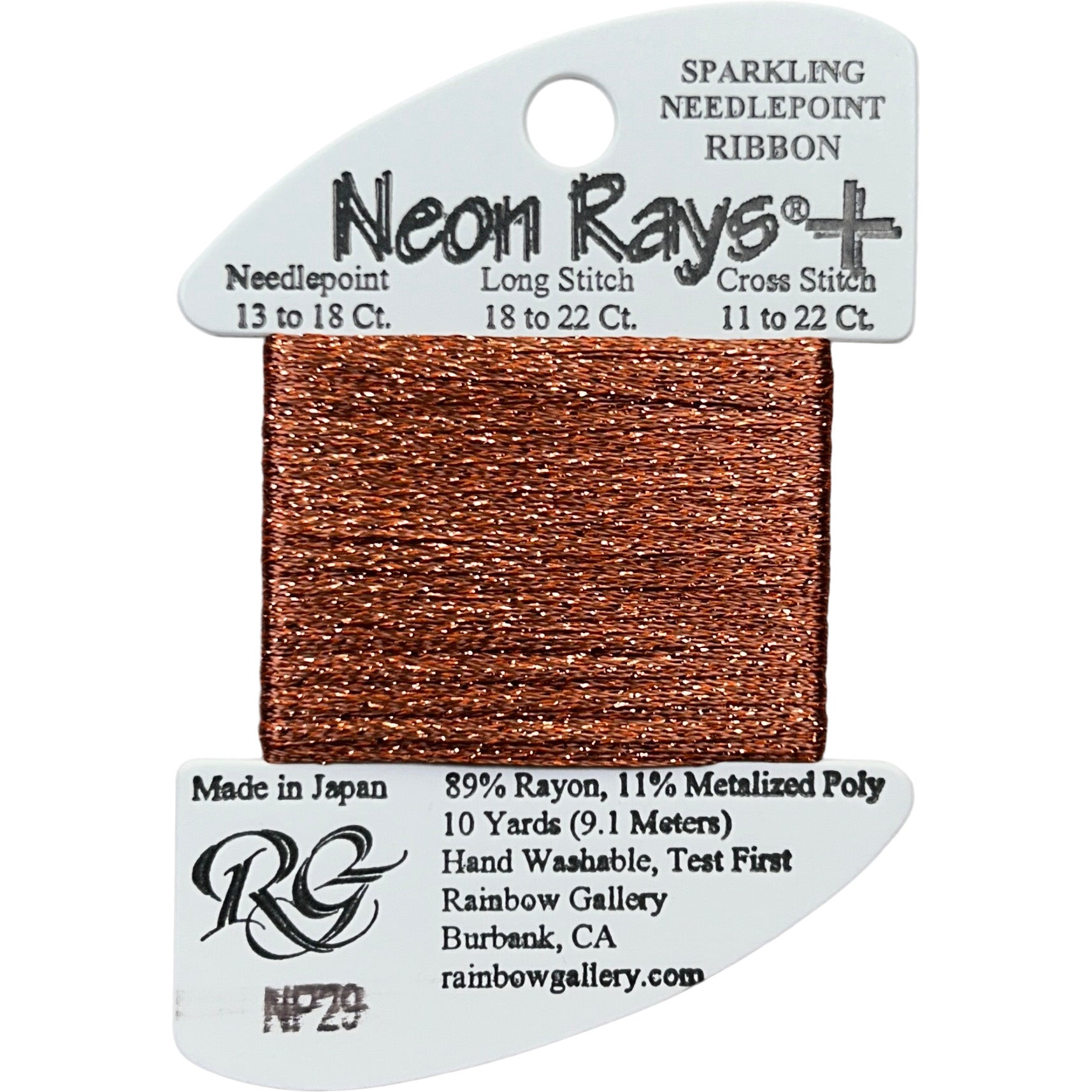 This is Neon Rays Plus from Rainbow Gallery in color 029 Rust. A shiny rayon ribbon with hints of sparkles that is excellent for creating metallic and porcelain textures. Works to great effect with long stitches. Use as-is on all sizes.