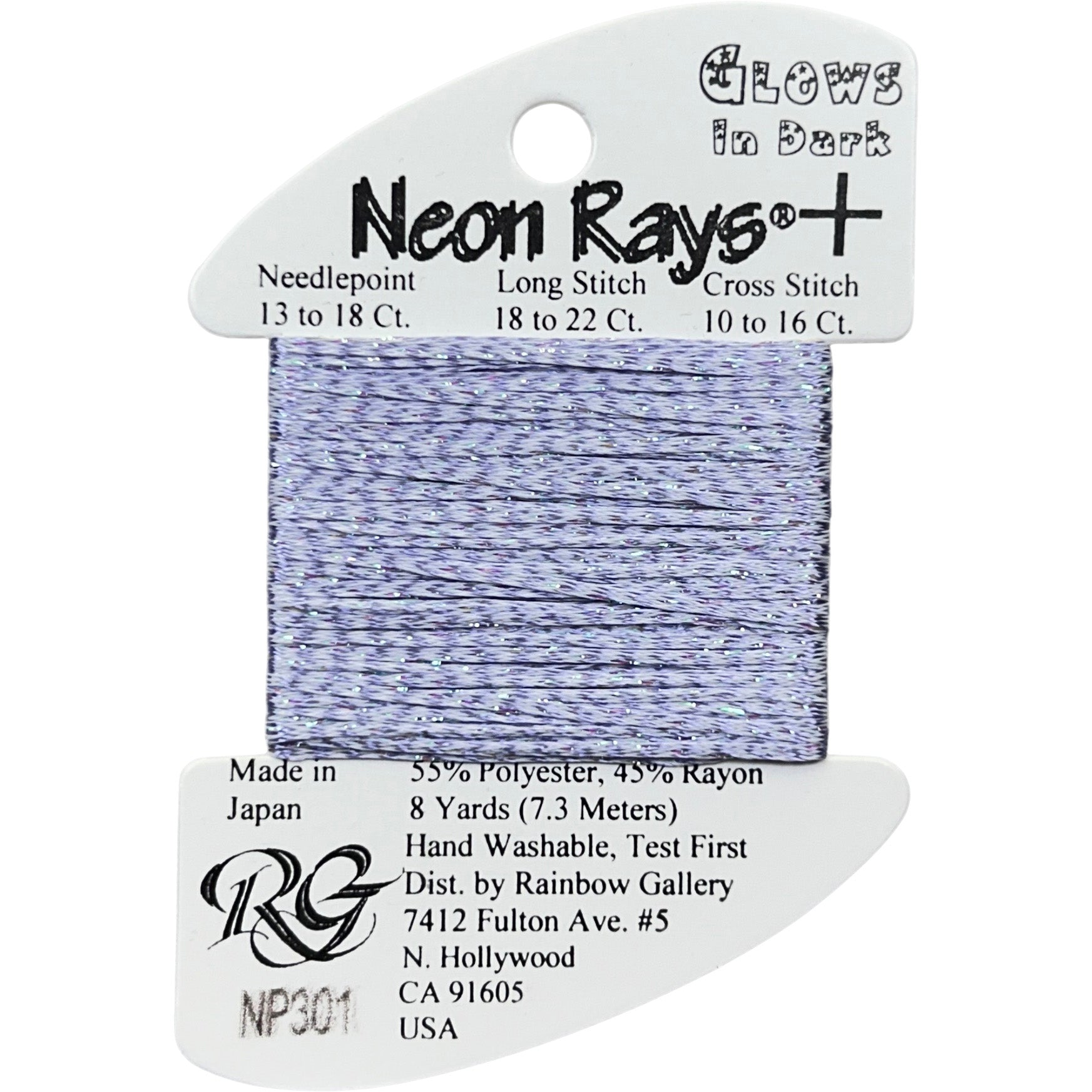 This is Neon Rays Plus from Rainbow Gallery in color 301 Violet Glow in Dark. A shiny rayon ribbon with hints of sparkles that is excellent for creating metallic and porcelain textures. Works to great effect with long stitches. Use as-is on all sizes.