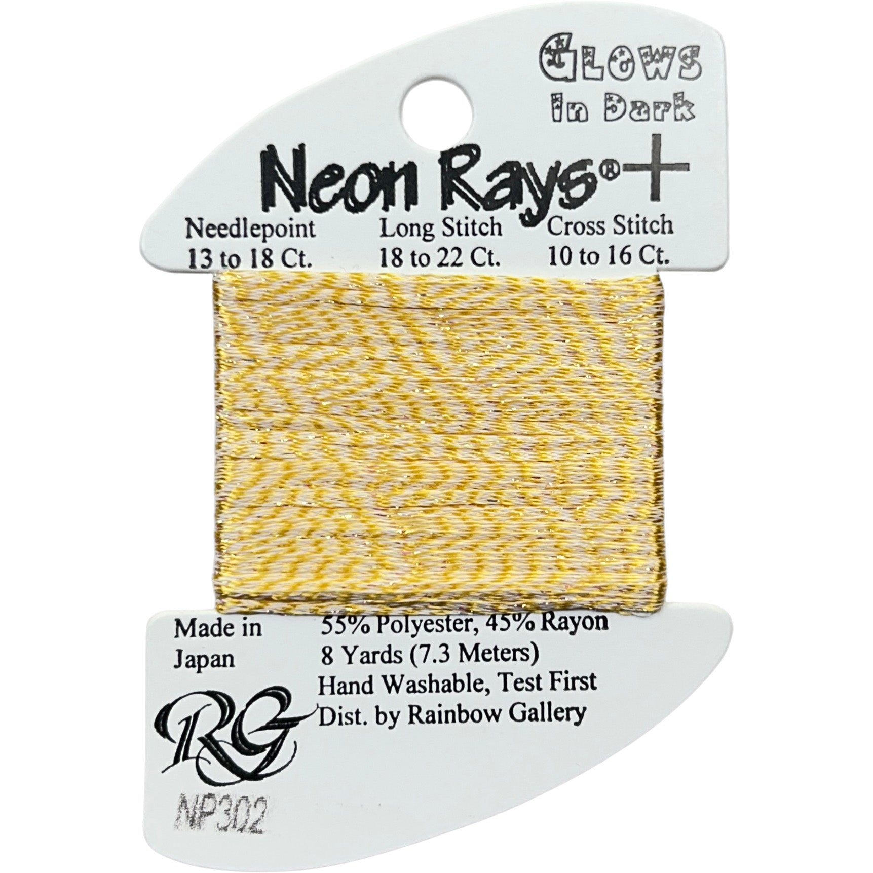 This is Neon Rays Plus from Rainbow Gallery in color 302 Yellow Glow in Dark. A shiny rayon ribbon with hints of sparkles that is excellent for creating metallic and porcelain textures. Works to great effect with long stitches. Use as-is on all sizes.