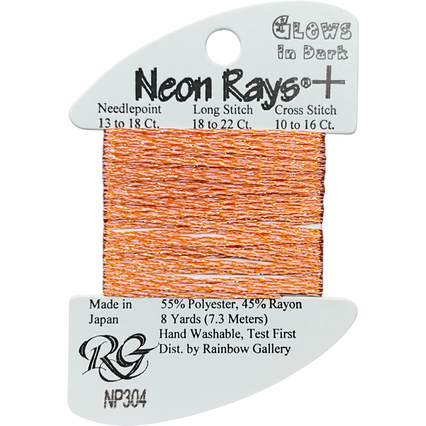 This is Neon Rays Plus from Rainbow Gallery in color 304 Orange Glow in Dark. A shiny rayon ribbon with hints of sparkles that is excellent for creating metallic and porcelain textures. Works to great effect with long stitches. Use as-is on all sizes.