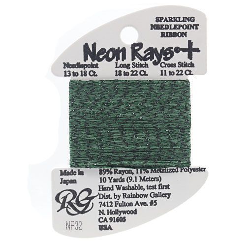 This is Neon Rays Plus from Rainbow Gallery in color 032 Spruce Green. A shiny rayon ribbon with hints of sparkles that is excellent for creating metallic and porcelain textures. Works to great effect with long stitches. Use as-is on all sizes.