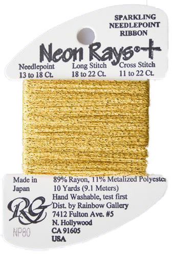 This is Neon Rays Plus from Rainbow Gallery in color 080 Gold. A shiny rayon ribbon with hints of sparkles that is excellent for creating metallic and porcelain textures. Works to great effect with long stitches. Use as-is on all sizes.