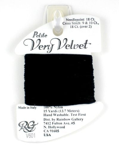This is Petite Very Velvet from Rainbow Gallery in color 601 Black. A velvet thread perfect for stitching gloves, scarves, and other textures! Use as-is on 18 mesh.