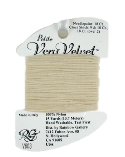 This is Petite Very Velvet from Rainbow Gallery in color 603 Ecru. A velvet thread perfect for stitching gloves, scarves, and other textures! Use as-is on 18 mesh.