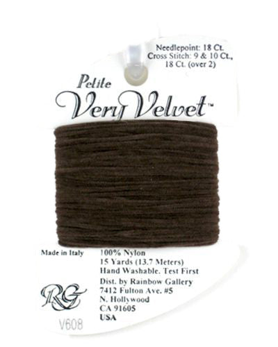 This is Petite Very Velvet from Rainbow Gallery in color 608 Dark Brown. A velvet thread perfect for stitching gloves, scarves, and other textures! Use as-is on 18 mesh.