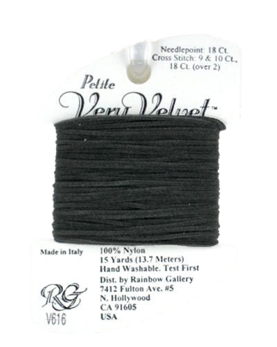 This is Petite Very Velvet from Rainbow Gallery in color 616 Dark gray. A velvet thread perfect for stitching gloves, scarves, and other textures! Use as-is on 18 mesh.
