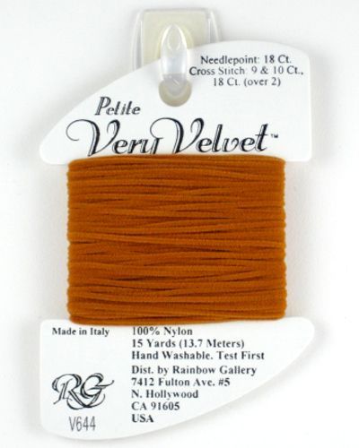 This is Petite Very Velvet from Rainbow Gallery in color 644 Light Golden Brown. A velvet thread perfect for stitching gloves, scarves, and other textures! Use as-is on 18 mesh.