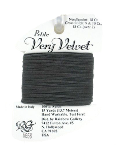 This is Petite Very Velvet from Rainbow Gallery in color 656 Gray. A velvet thread perfect for stitching gloves, scarves, and other textures! Use as-is on 18 mesh.