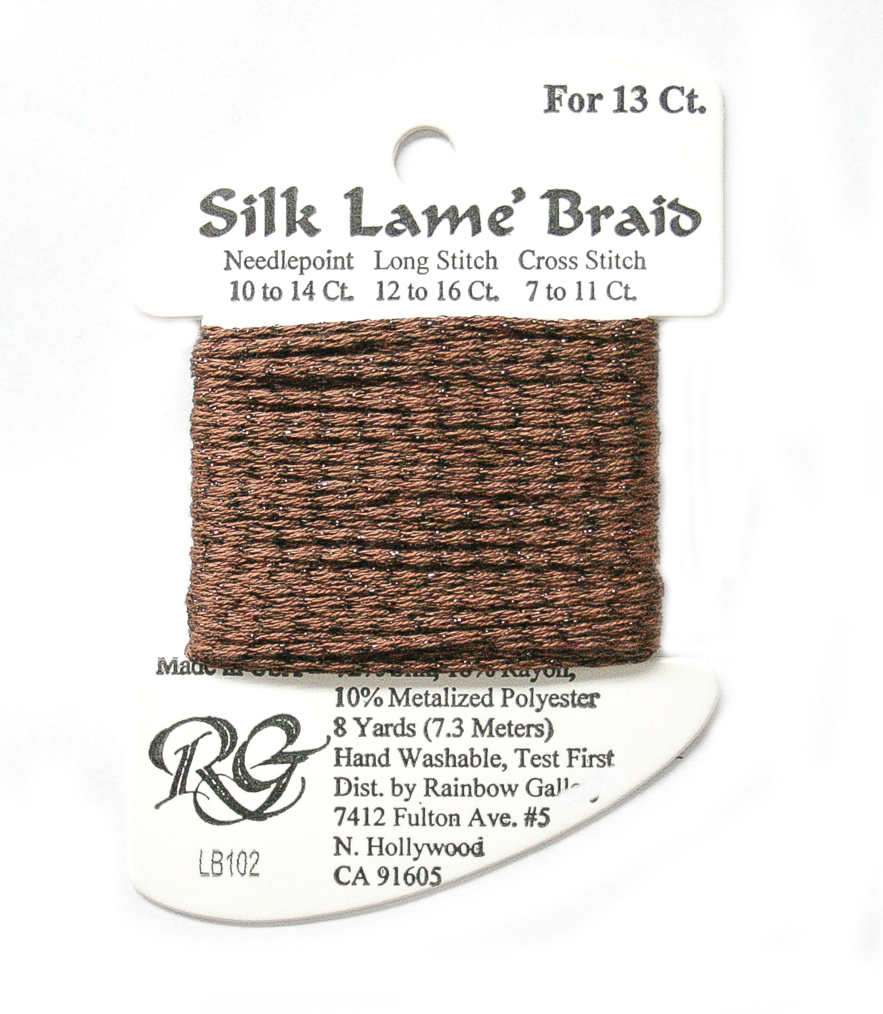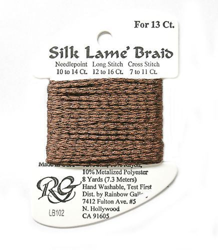 This is Silk Lame Braid 13 from Rainbow Gallery in color 102 Warm Brown. A great thread for adding sparkle to 13 mesh projects. Use as-is on 13 mesh.