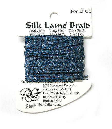 This is Silk Lame Braid 13 from Rainbow Gallery in color 106 Dark Denim. A great thread for adding sparkle to 13 mesh projects. Use as-is on 13 mesh.