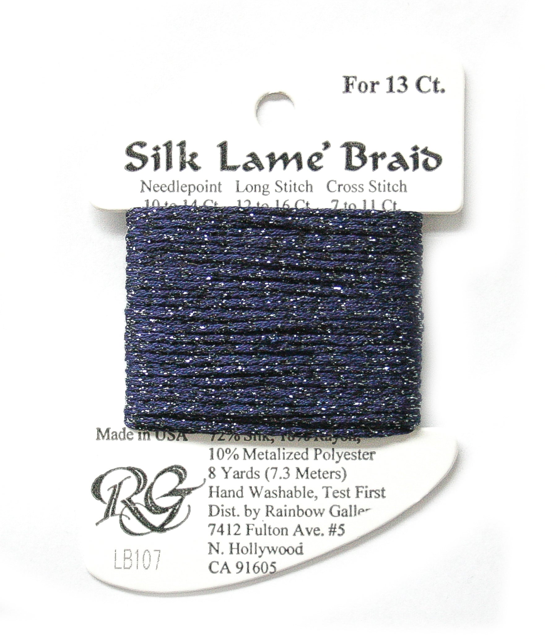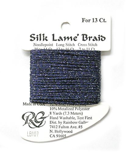 This is Silk Lame Braid 13 from Rainbow Gallery in color 107 Deep Cobalt. A great thread for adding sparkle to 13 mesh projects. Use as-is on 13 mesh.
