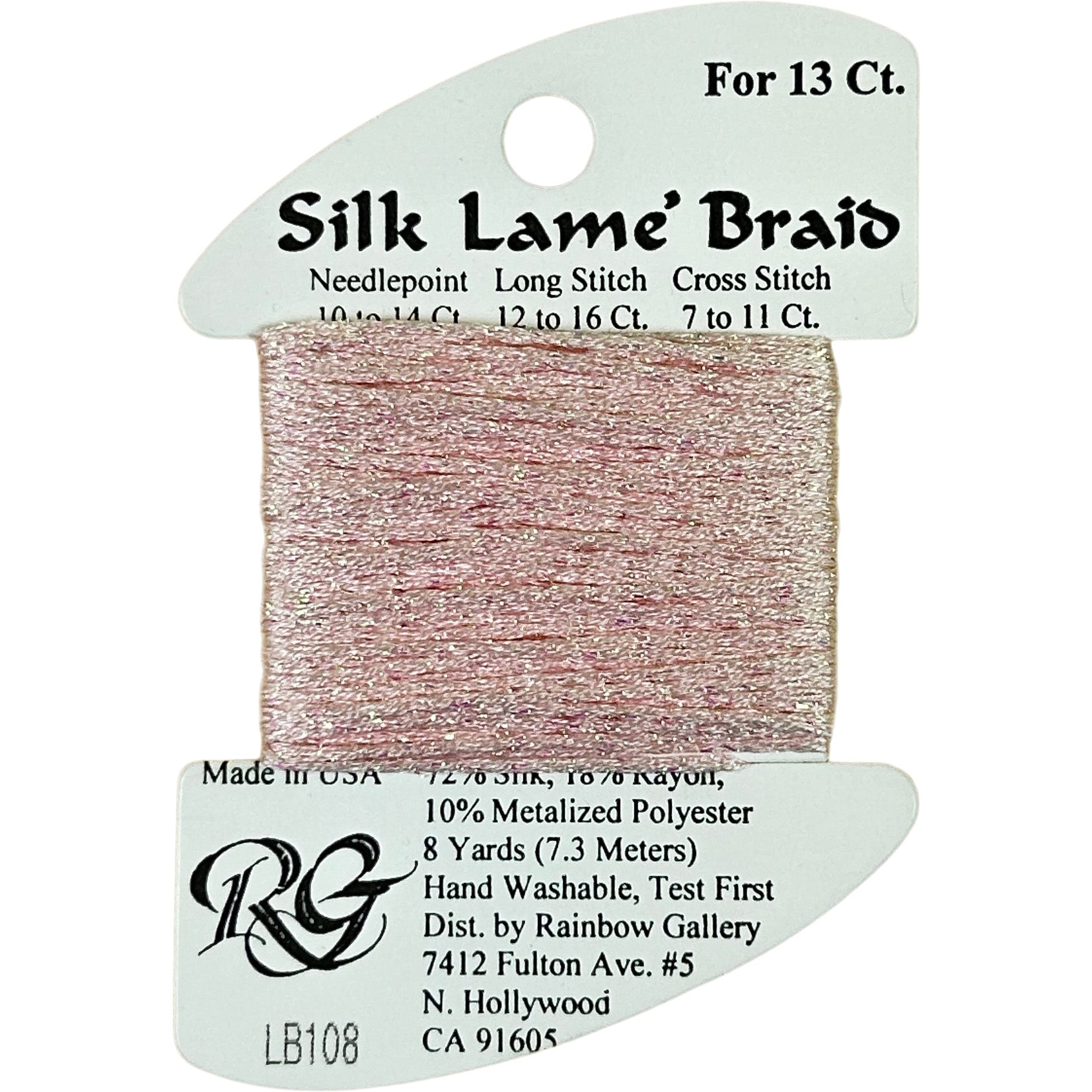 This is Silk Lame Braid 13 from Rainbow Gallery in color 108 Soft Pink. A great thread for adding sparkle to 13 mesh projects. Use as-is on 13 mesh.
