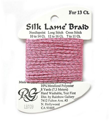 This is Silk Lame Braid 13 from Rainbow Gallery in color 109 Medium Raspberry. A great thread for adding sparkle to 13 mesh projects. Use as-is on 13 mesh.