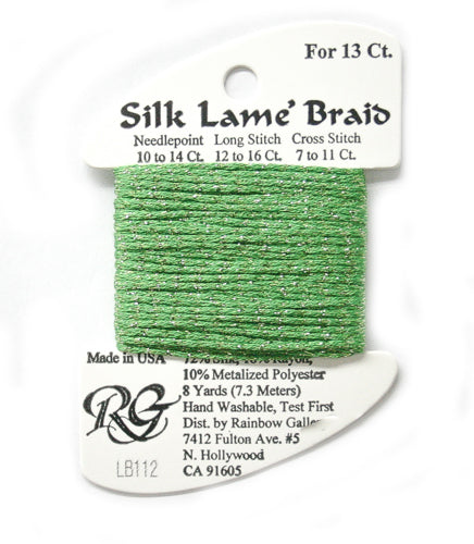 This is Silk Lame Braid 13 from Rainbow Gallery in color 112 Spring Green. A great thread for adding sparkle to 13 mesh projects. Use as-is on 13 mesh.