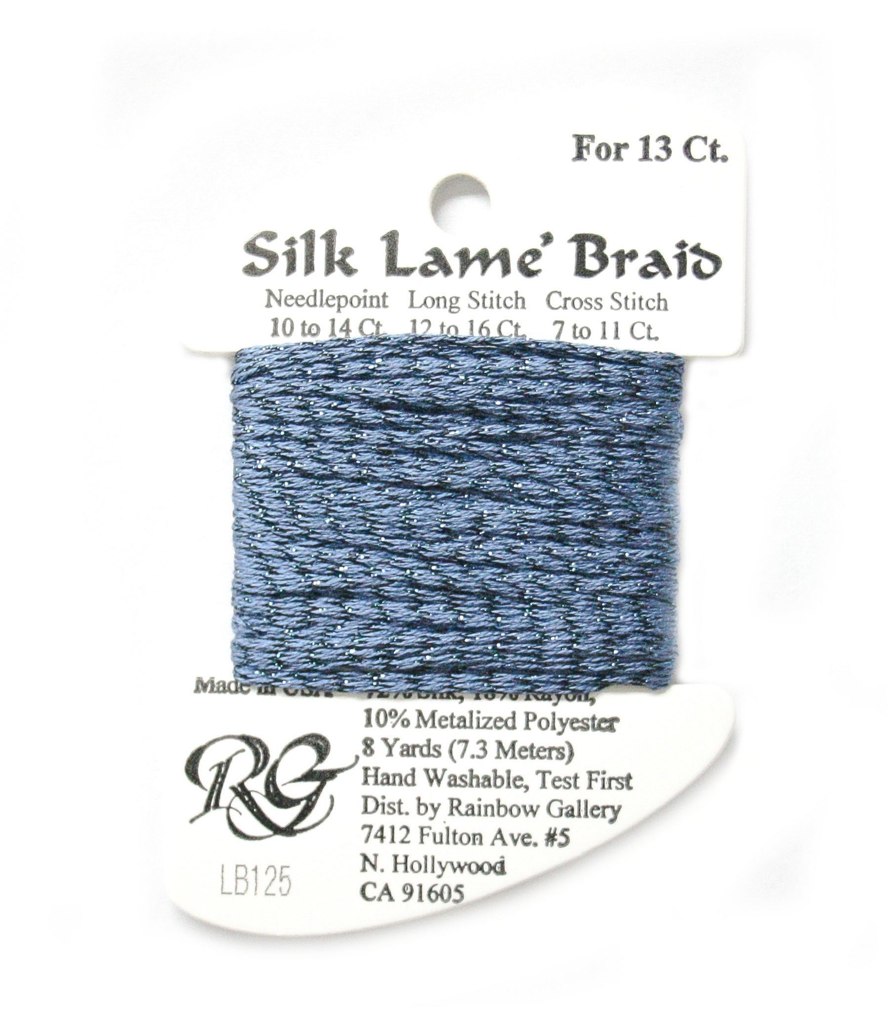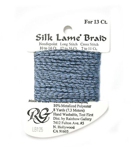 This is Silk Lame Braid 13 from Rainbow Gallery in color 125 Denim. A great thread for adding sparkle to 13 mesh projects. Use as-is on 13 mesh.