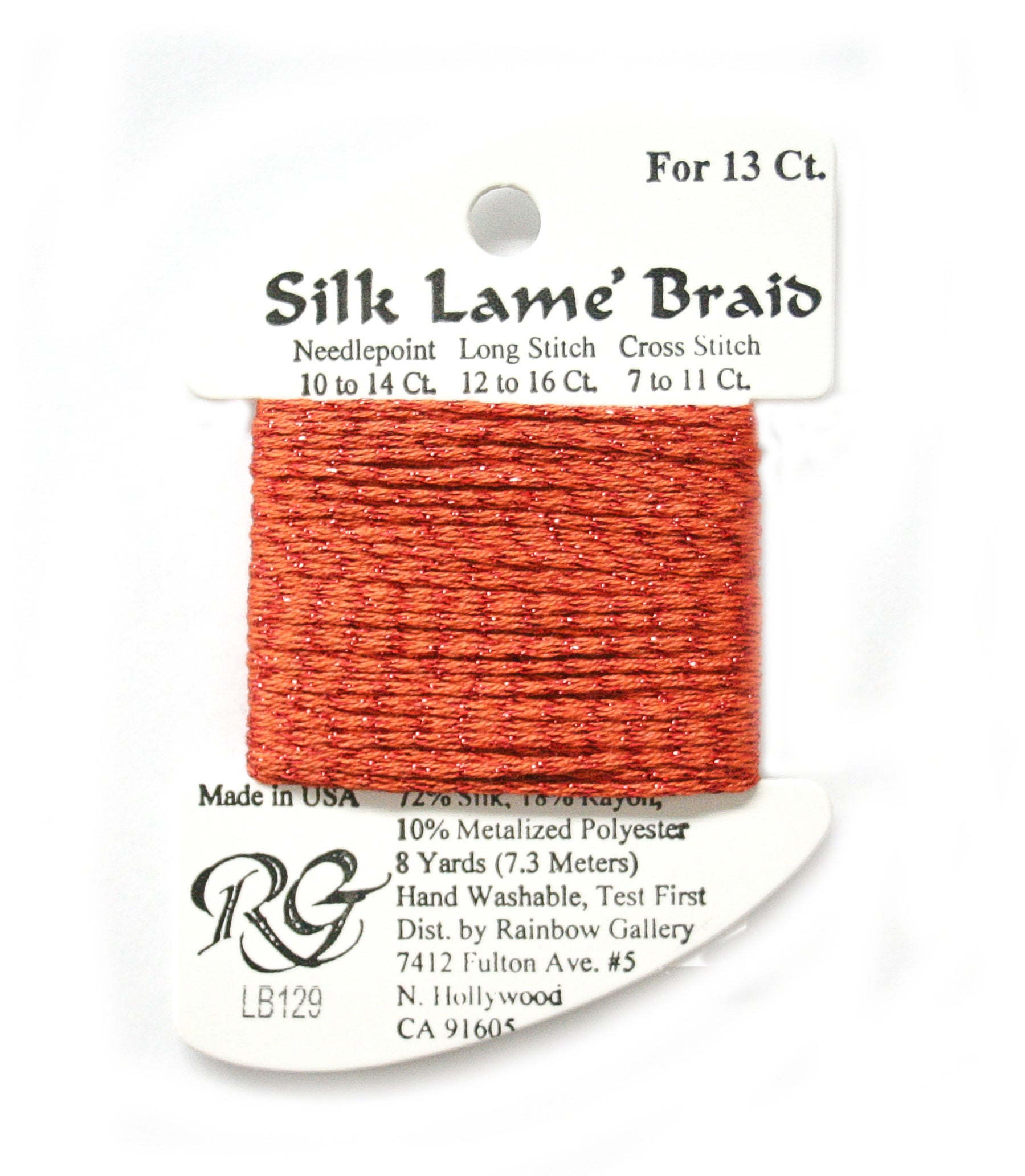 This is Silk Lame Braid 13 from Rainbow Gallery in color 129 Tabasco. A great thread for adding sparkle to 13 mesh projects. Use as-is on 13 mesh.