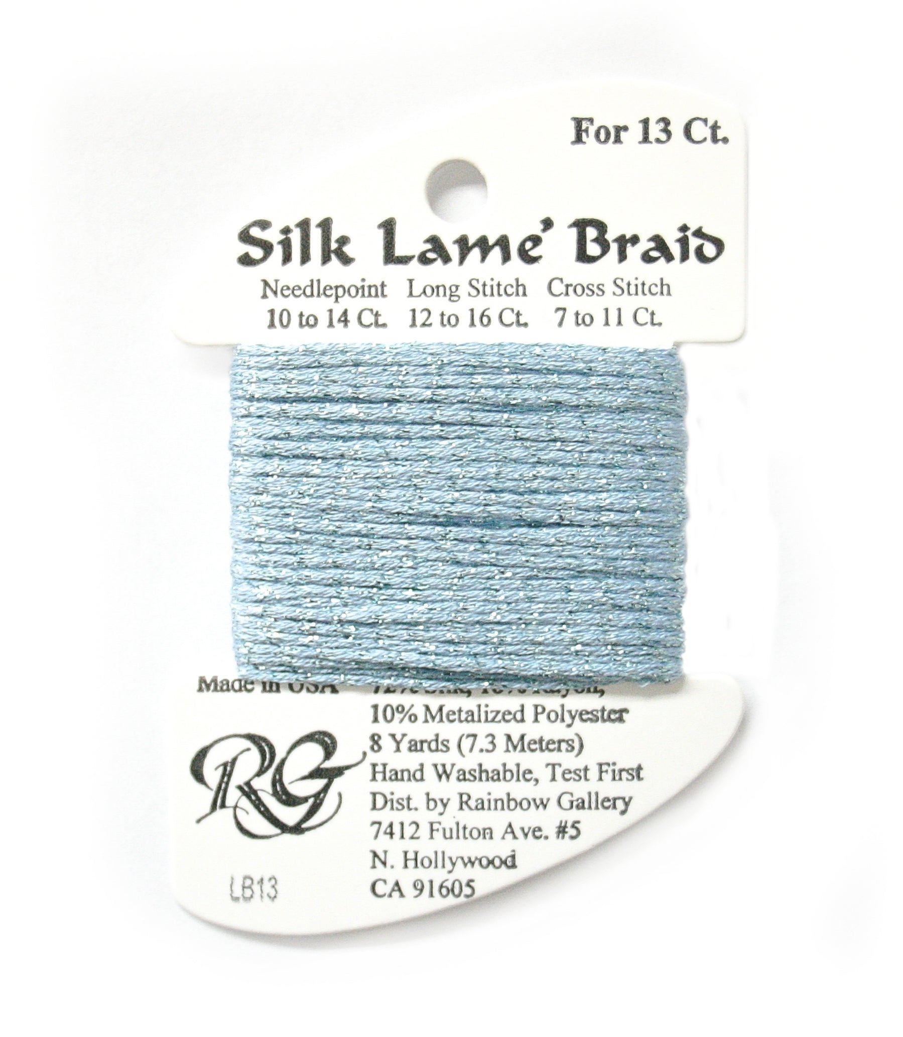 This is Silk Lame Braid 13 from Rainbow Gallery in color 013 Sky Blue. A great thread for adding sparkle to 13 mesh projects. Use as-is on 13 mesh.