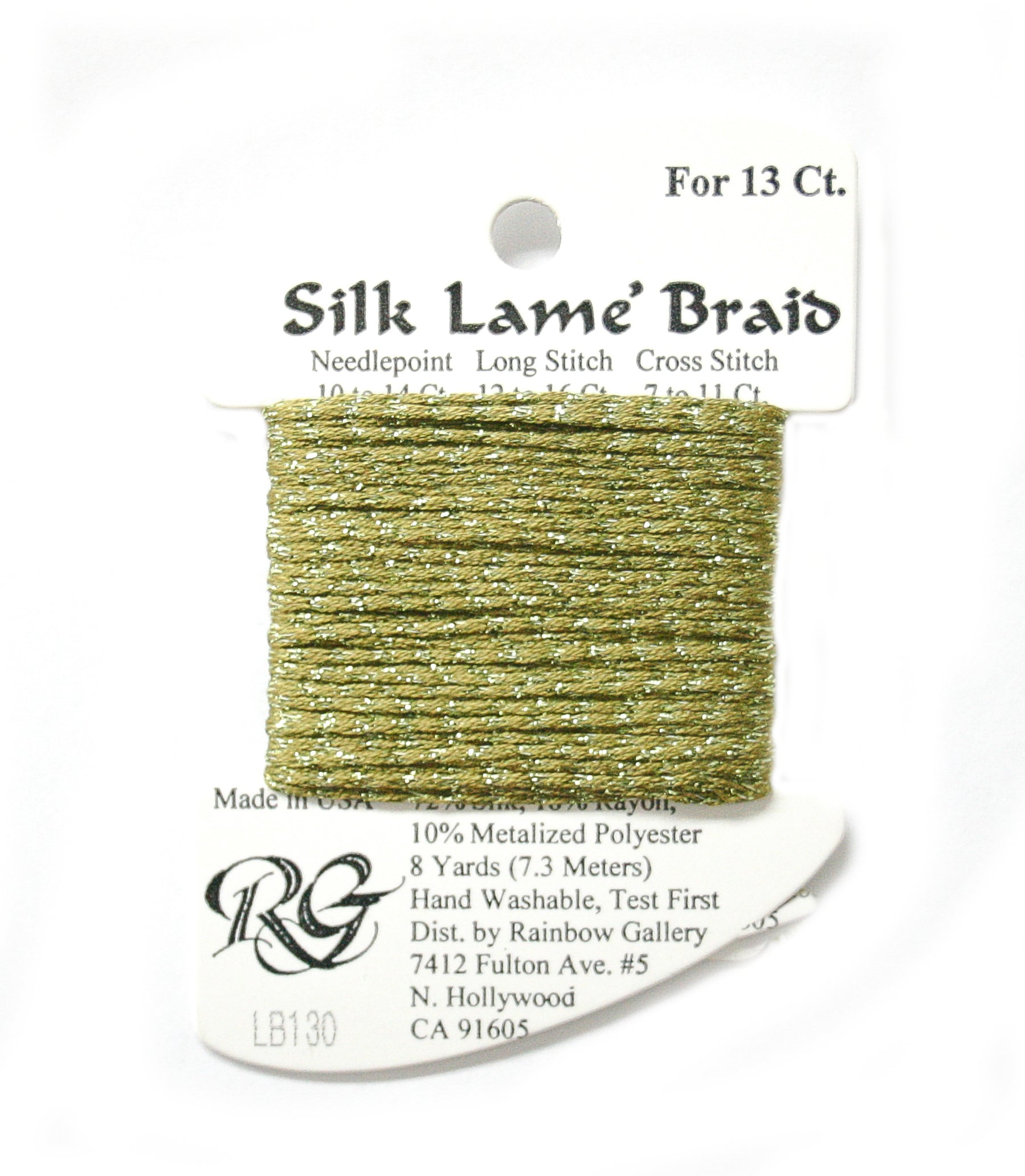This is Silk Lame Braid 13 from Rainbow Gallery in color 130 Moss. A great thread for adding sparkle to 13 mesh projects. Use as-is on 13 mesh.