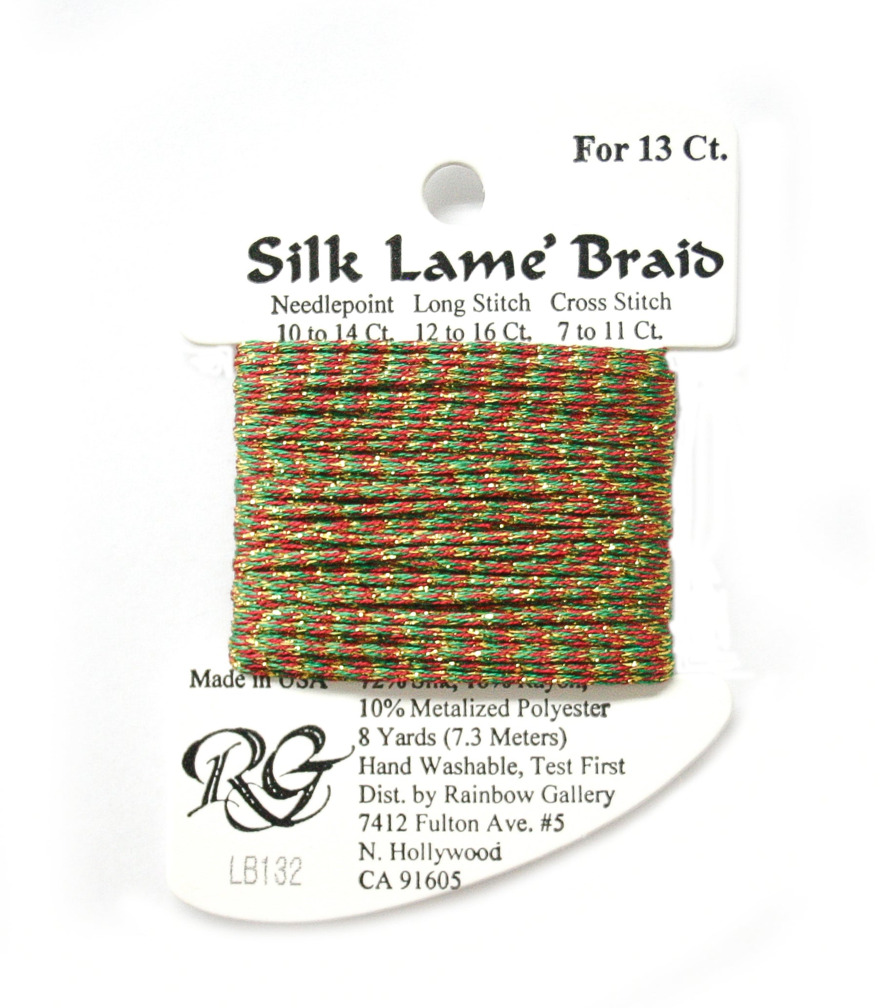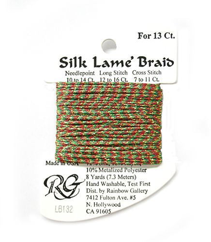 This is Silk Lame Braid 13 from Rainbow Gallery in color 132 Christmas. A great thread for adding sparkle to 13 mesh projects. Use as-is on 13 mesh.