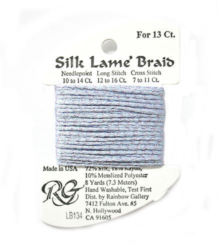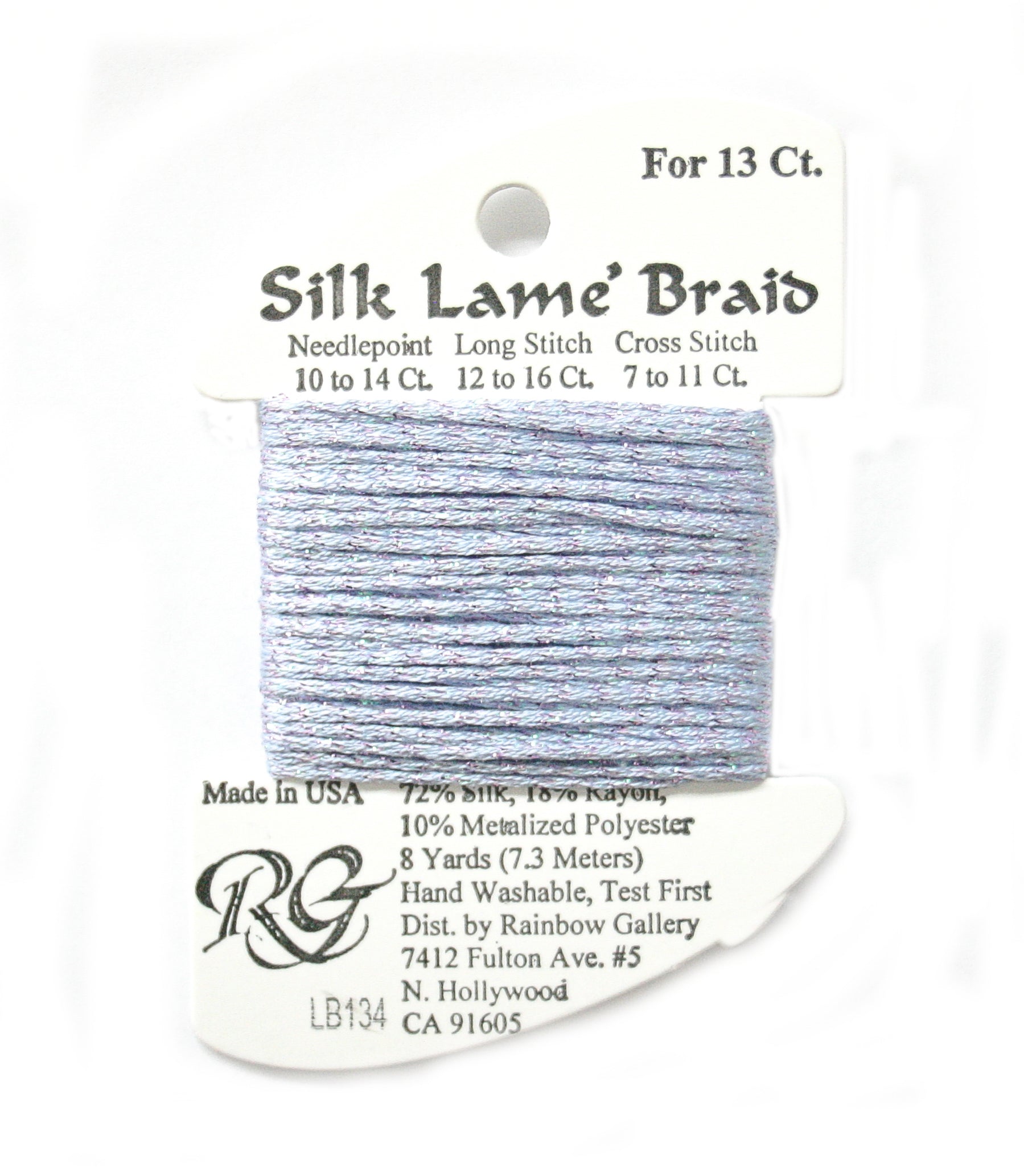 This is Silk Lame Braid 13 from Rainbow Gallery in color 134 Misty Lilac. A great thread for adding sparkle to 13 mesh projects. Use as-is on 13 mesh.
