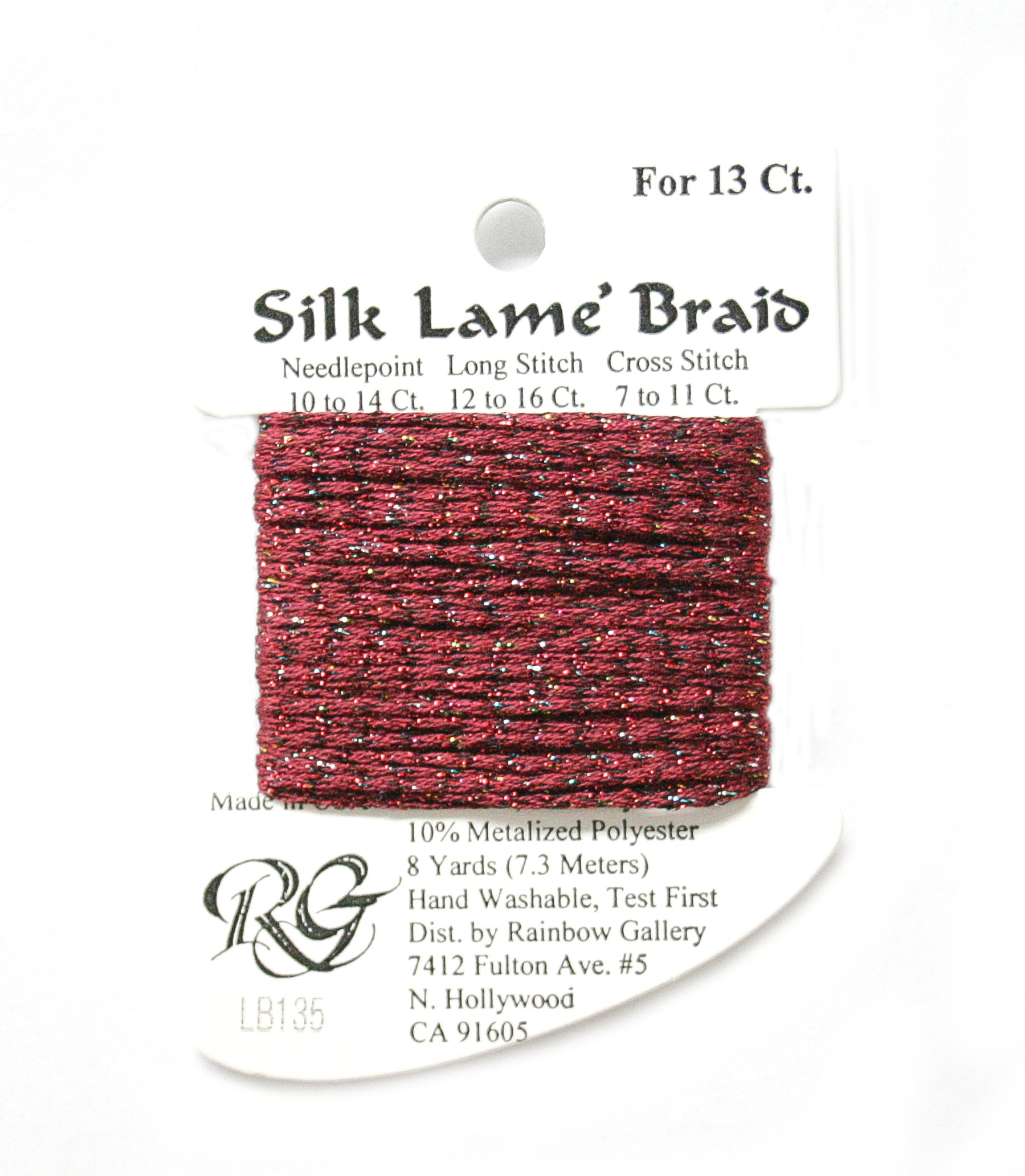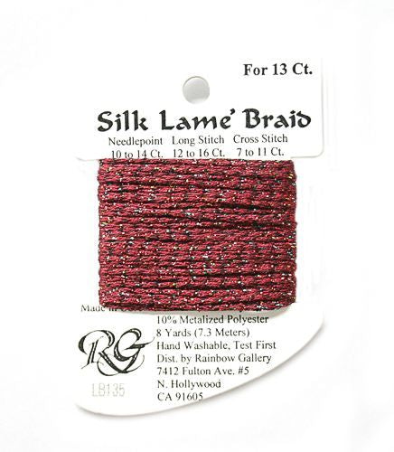 This is Silk Lame Braid 13 from Rainbow Gallery in color 135 Red Sparkle. A great thread for adding sparkle to 13 mesh projects. Use as-is on 13 mesh.