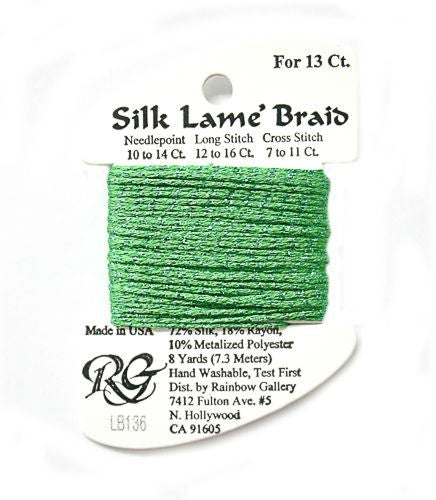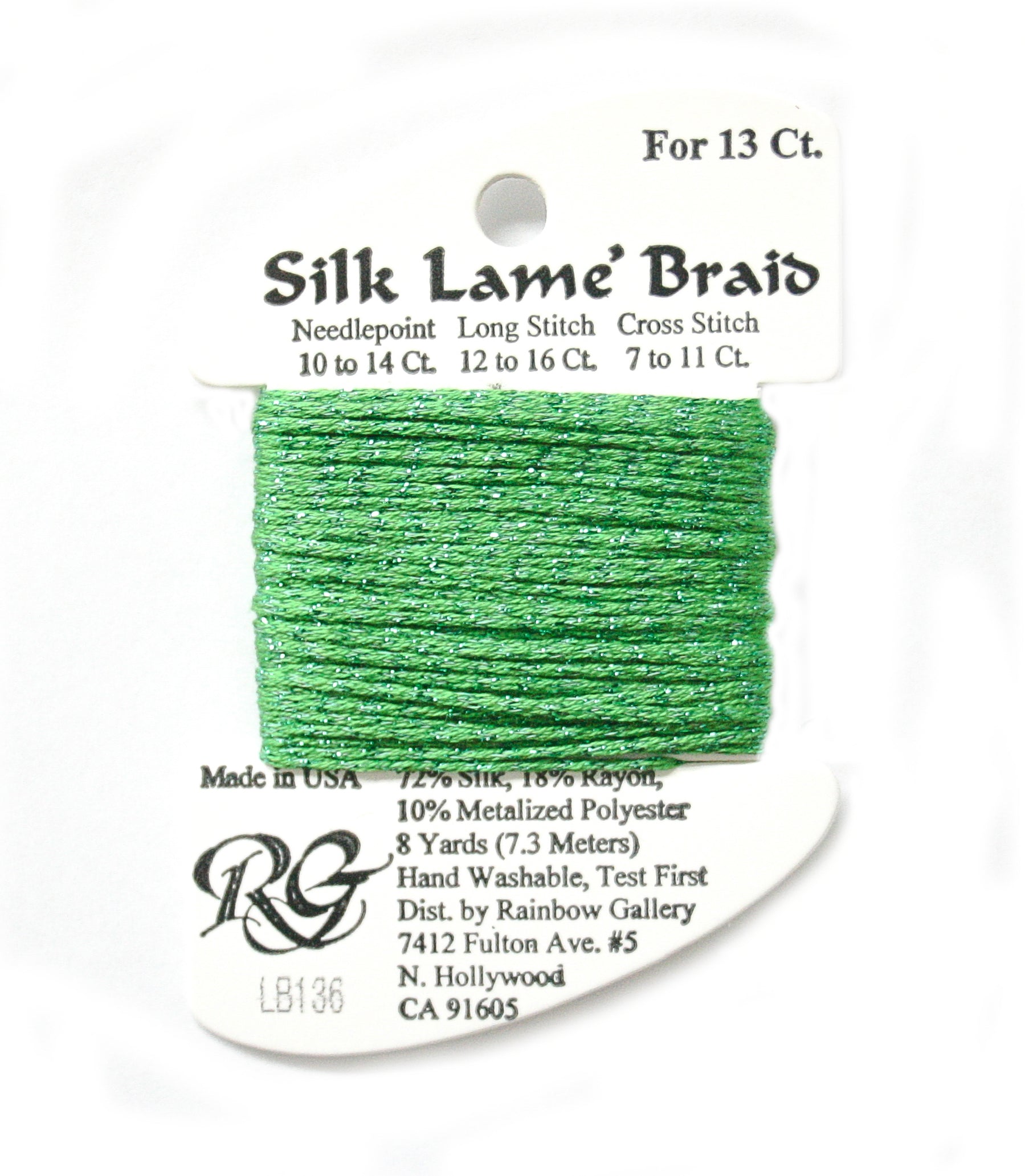 This is Silk Lame Braid 13 from Rainbow Gallery in color 136 Kelly Green. A great thread for adding sparkle to 13 mesh projects. Use as-is on 13 mesh.