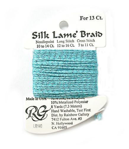 This is Silk Lame Braid 13 from Rainbow Gallery in color 140 Jamacian Sea. A great thread for adding sparkle to 13 mesh projects. Use as-is on 13 mesh.