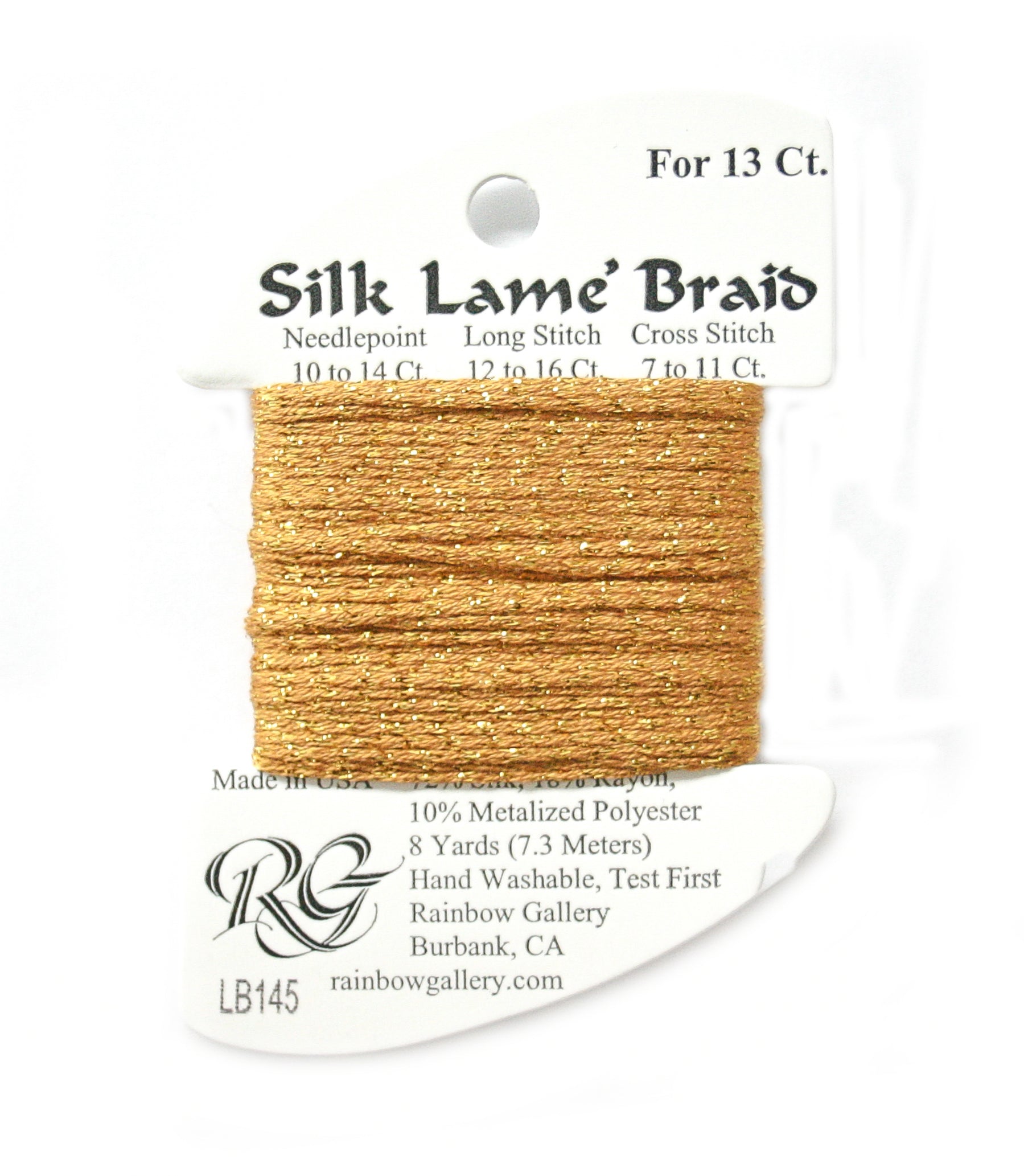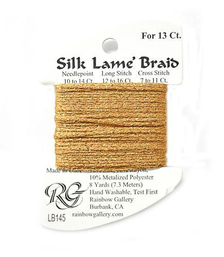 This is Silk Lame Braid 13 from Rainbow Gallery in color 145 Fool's Gold. A great thread for adding sparkle to 13 mesh projects. Use as-is on 13 mesh.