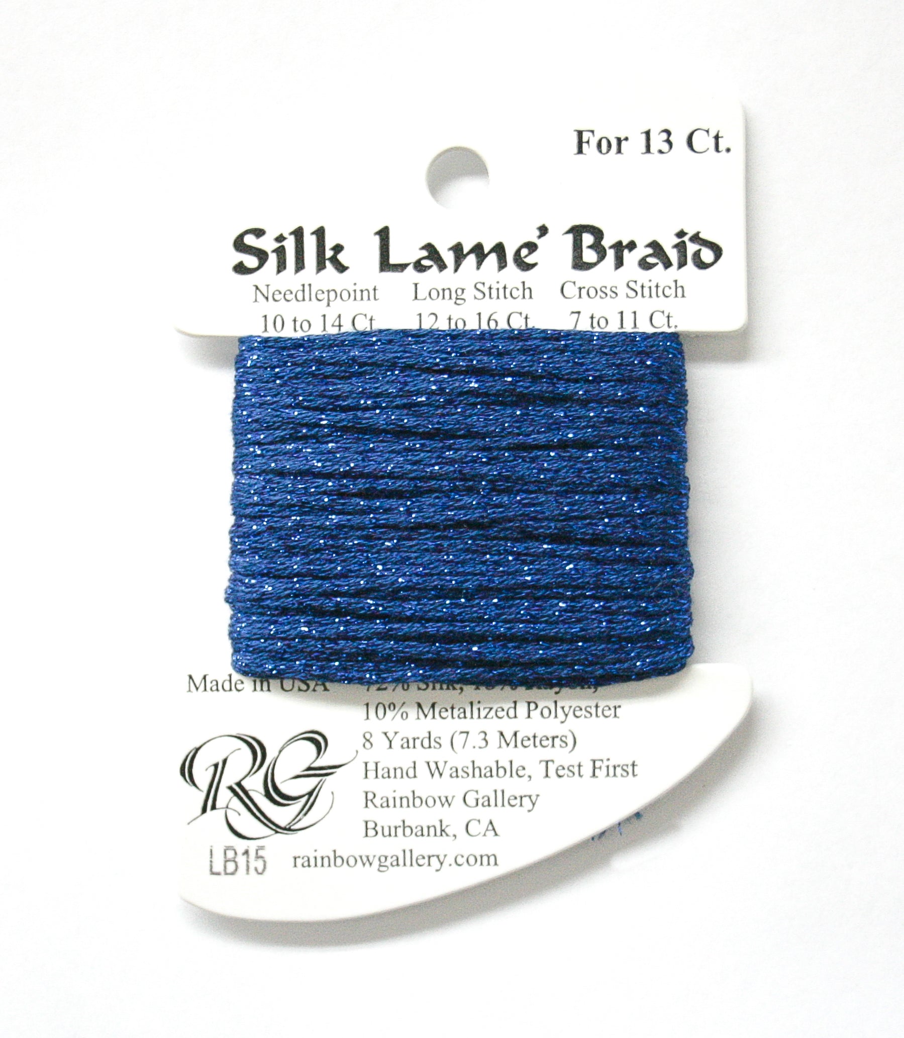 This is Silk Lame Braid 13 from Rainbow Gallery in color 015 Dark Blue. A great thread for adding sparkle to 13 mesh projects. Use as-is on 13 mesh.