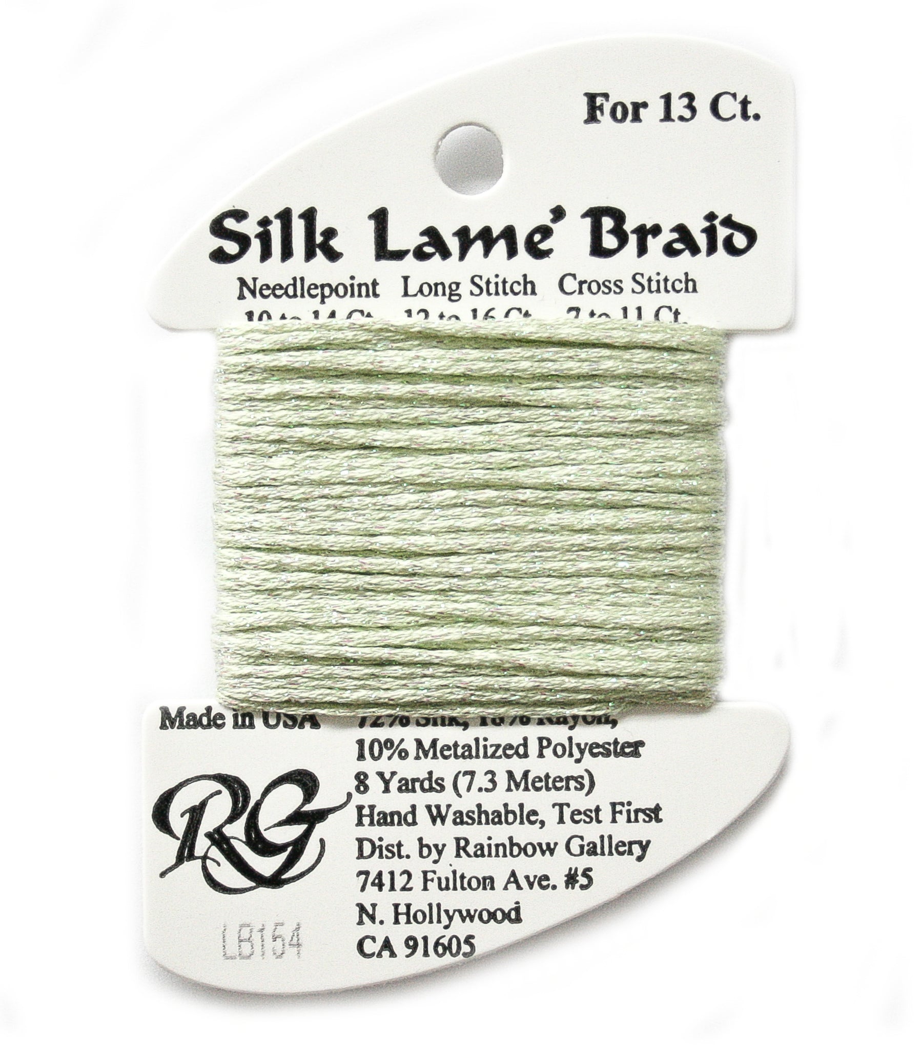 This is Silk Lame Braid 13 from Rainbow Gallery in color 154 Misty Green. A great thread for adding sparkle to 13 mesh projects. Use as-is on 13 mesh.