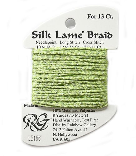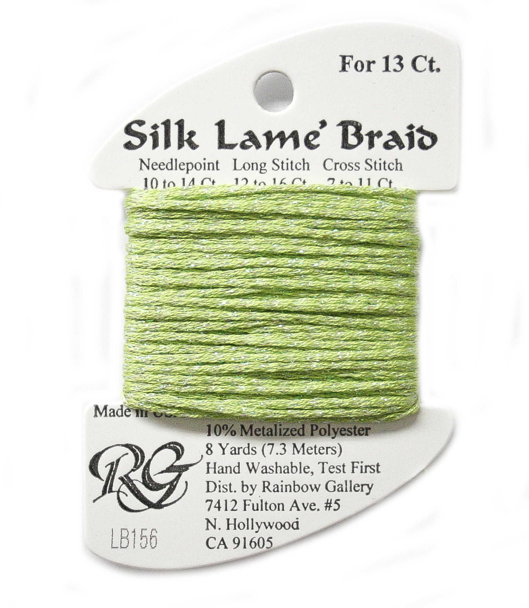 This is Silk Lame Braid 13 from Rainbow Gallery in color 156 Kiwi. A great thread for adding sparkle to 13 mesh projects. Use as-is on 13 mesh.