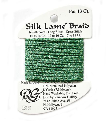 This is Silk Lame Braid 13 from Rainbow Gallery in color 161 Juniper. A great thread for adding sparkle to 13 mesh projects. Use as-is on 13 mesh.