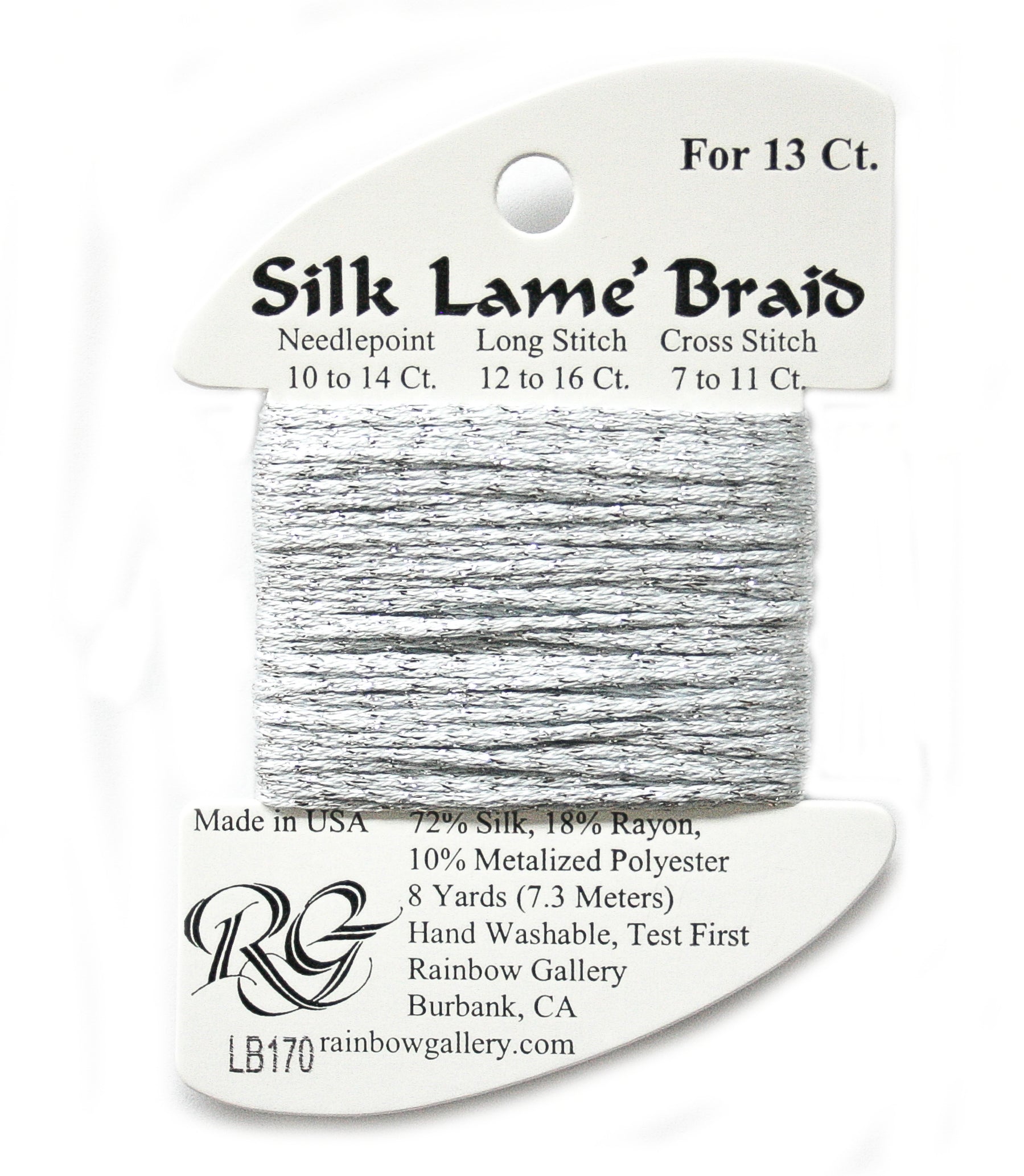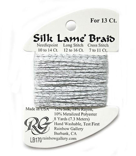 This is Silk Lame Braid 13 from Rainbow Gallery in color 170 Blue Fog. A great thread for adding sparkle to 13 mesh projects. Use as-is on 13 mesh.