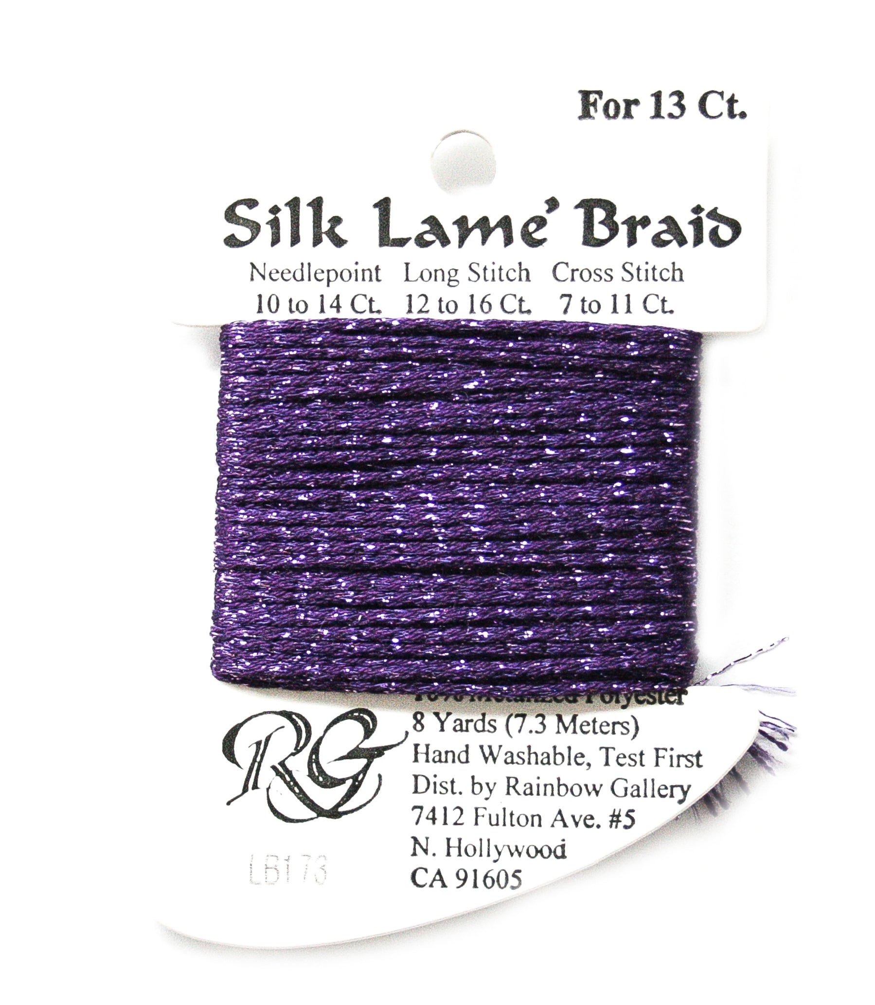 This is Silk Lame Braid 13 from Rainbow Gallery in color 173 Pansy. A great thread for adding sparkle to 13 mesh projects. Use as-is on 13 mesh.