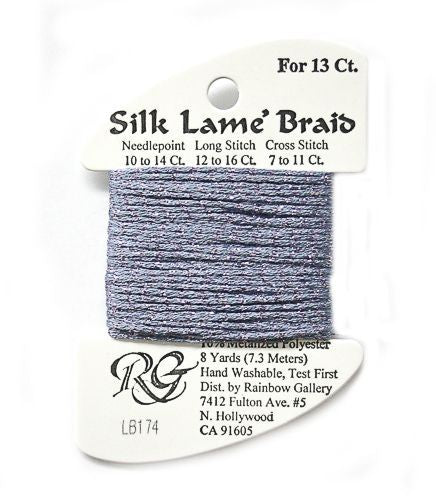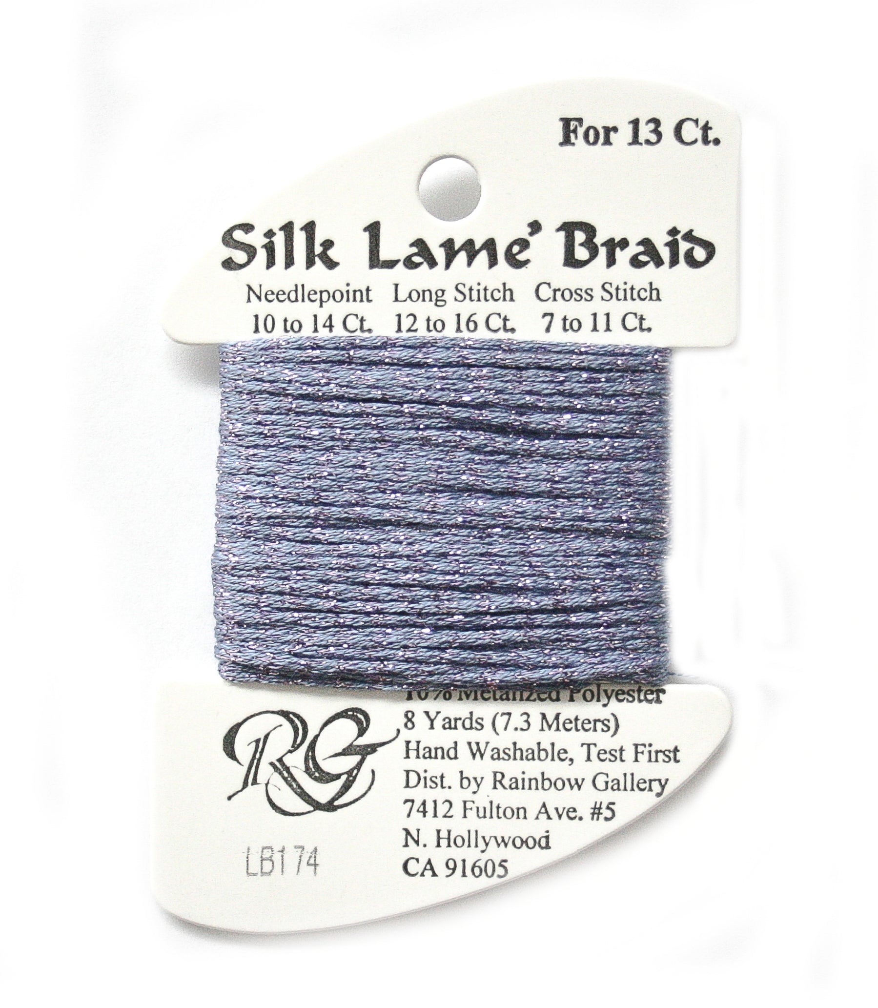 This is Silk Lame Braid 13 from Rainbow Gallery in color 174 Periwinkle. A great thread for adding sparkle to 13 mesh projects. Use as-is on 13 mesh.