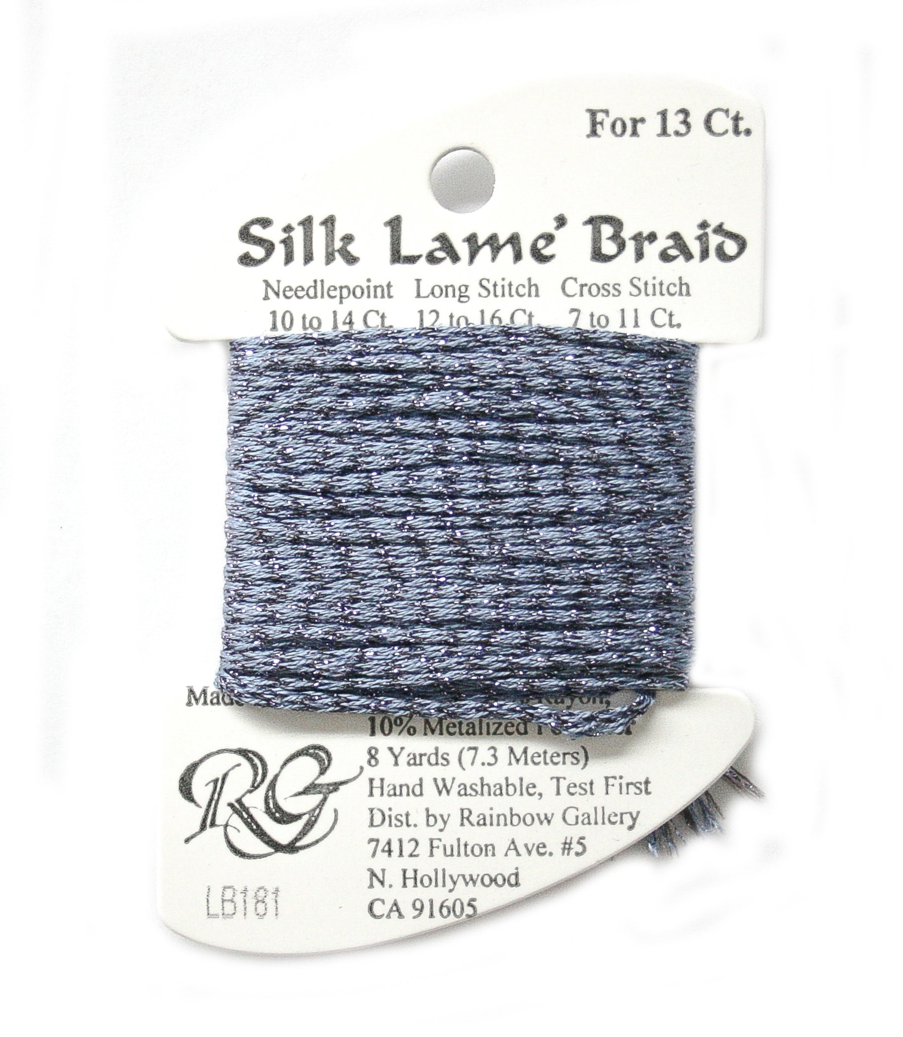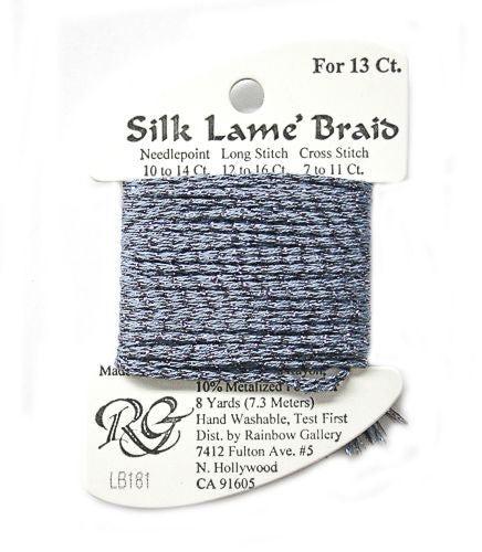 This is Silk Lame Braid 13 from Rainbow Gallery in color 181 Hydrangea. A great thread for adding sparkle to 13 mesh projects. Use as-is on 13 mesh.