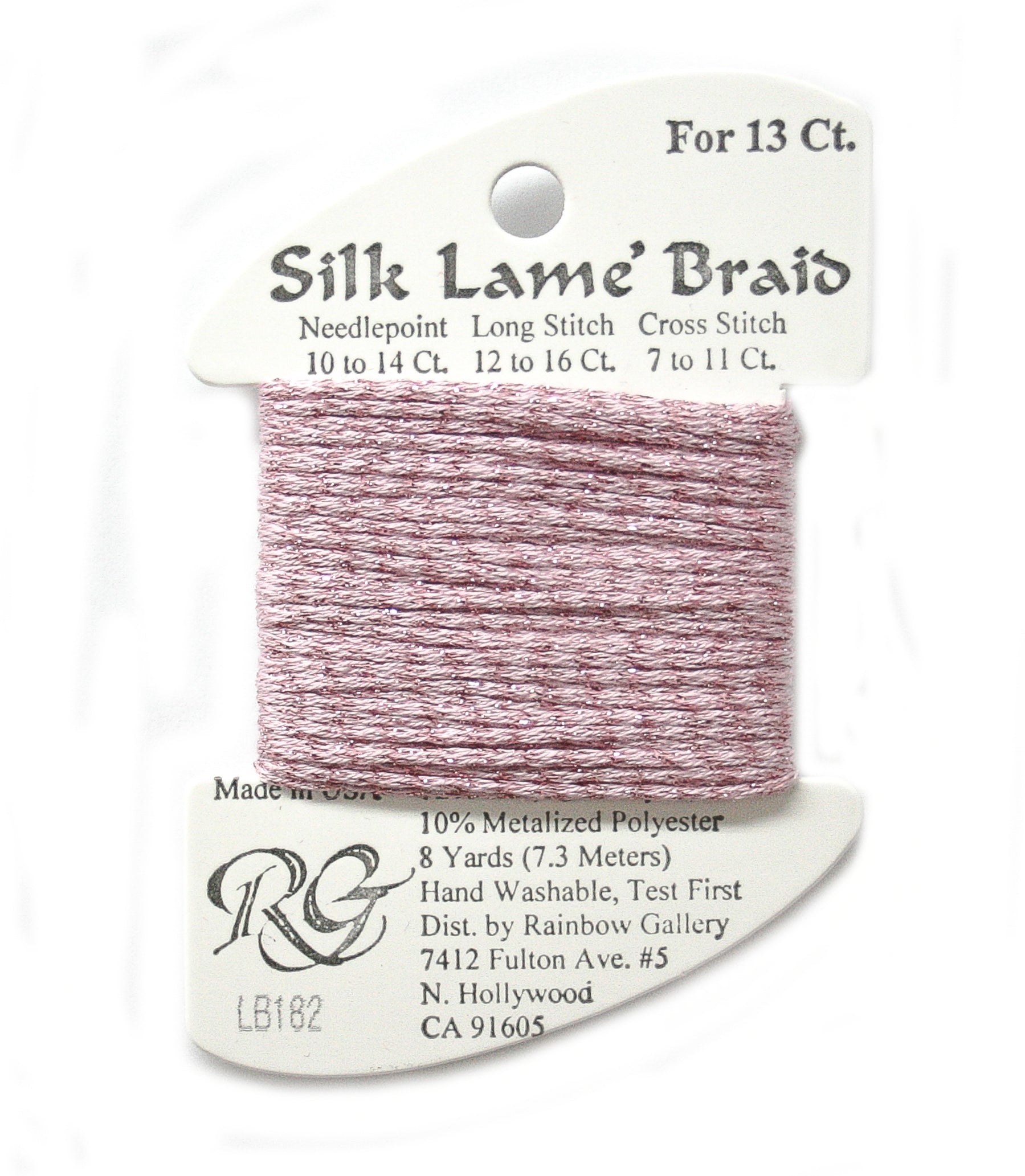 This is Silk Lame Braid 13 from Rainbow Gallery in color 182 Chateau Rose. A great thread for adding sparkle to 13 mesh projects. Use as-is on 13 mesh.