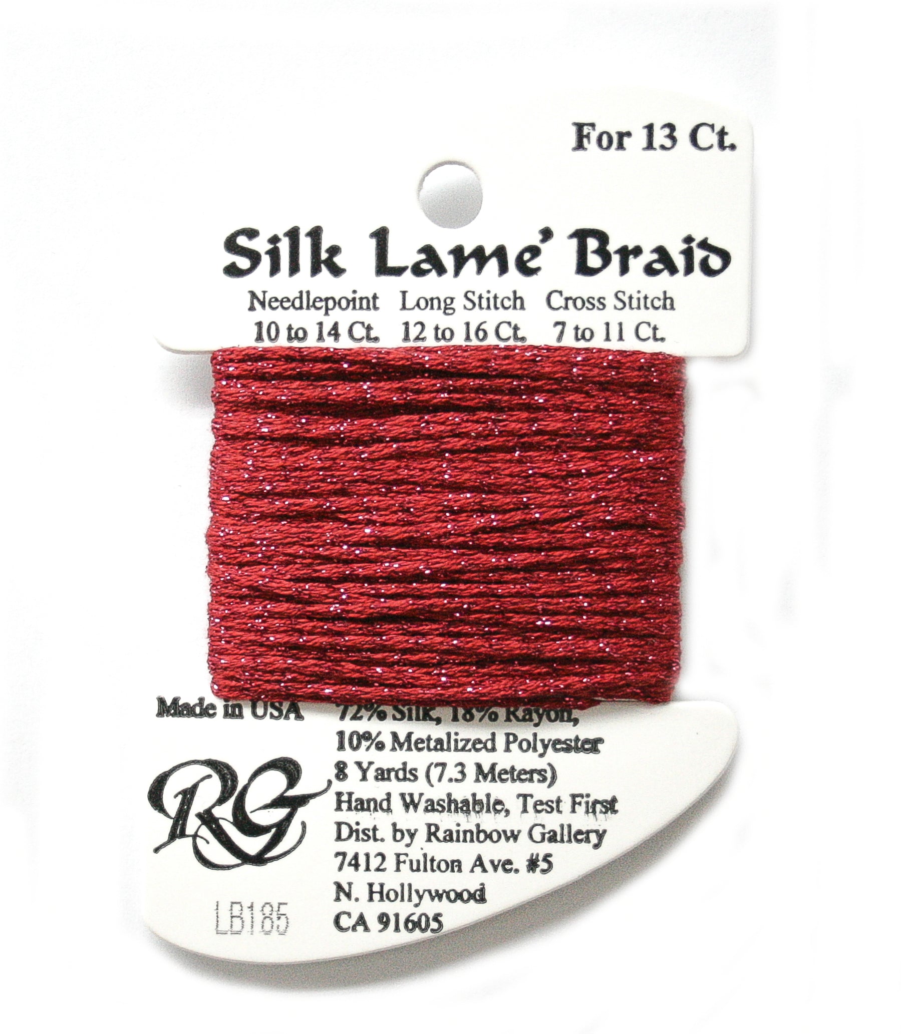 This is Silk Lame Braid 13 from Rainbow Gallery in color 185 Tango Red. A great thread for adding sparkle to 13 mesh projects. Use as-is on 13 mesh.