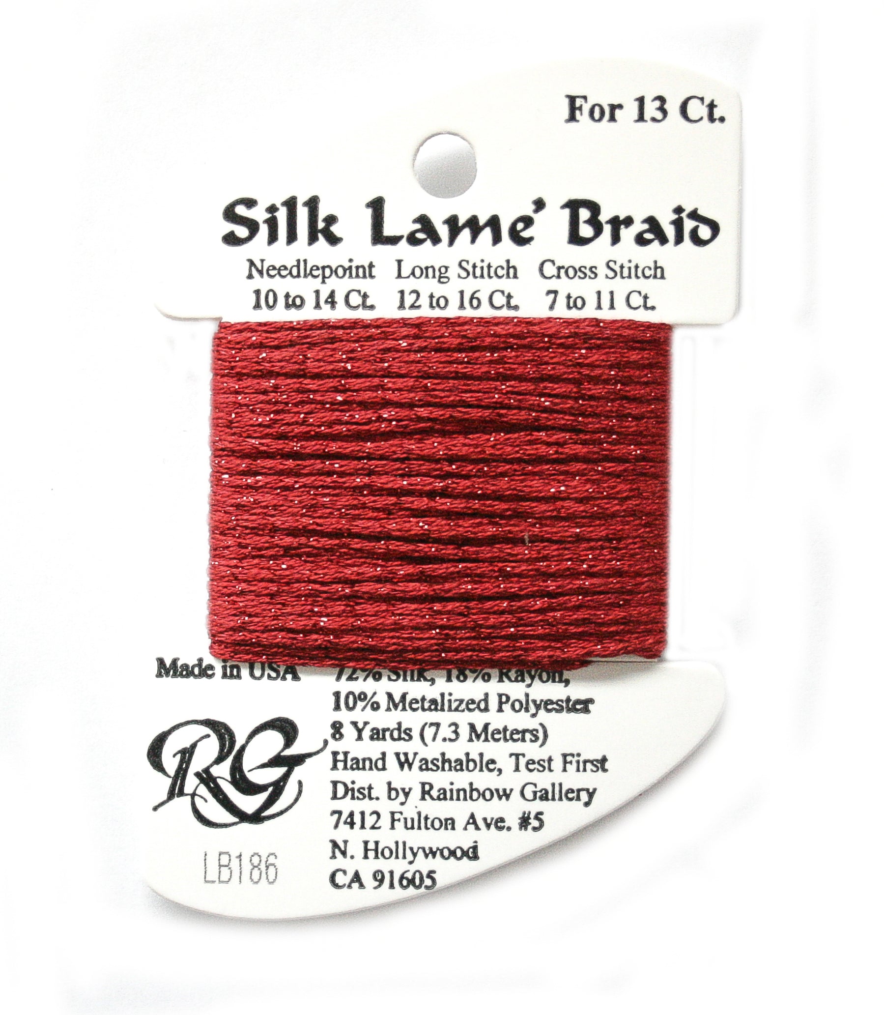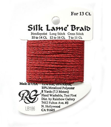 This is Silk Lame Braid 13 from Rainbow Gallery in color 186 Fiery Red. A great thread for adding sparkle to 13 mesh projects. Use as-is on 13 mesh.