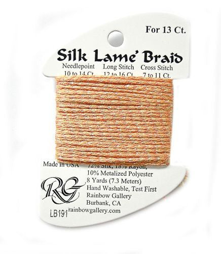 This is Silk Lame Braid 13 from Rainbow Gallery in color 191 Goldenrod. A great thread for adding sparkle to 13 mesh projects. Use as-is on 13 mesh.