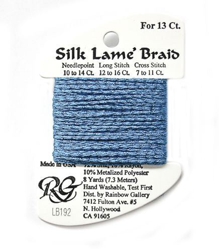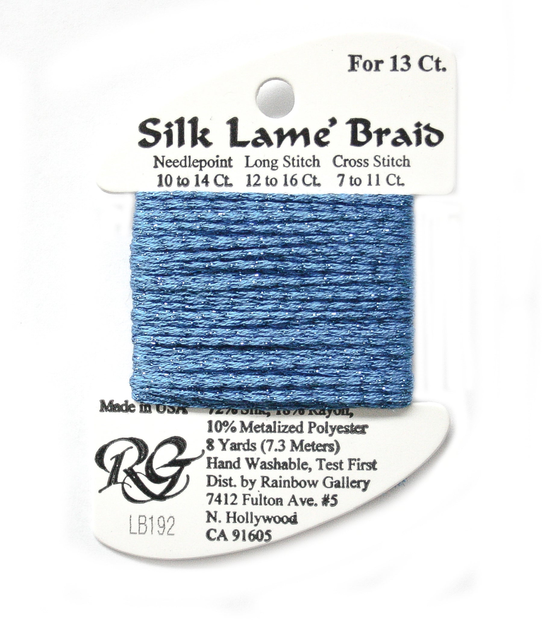 This is Silk Lame Braid 13 from Rainbow Gallery in color 192 Bluebird. A great thread for adding sparkle to 13 mesh projects. Use as-is on 13 mesh.