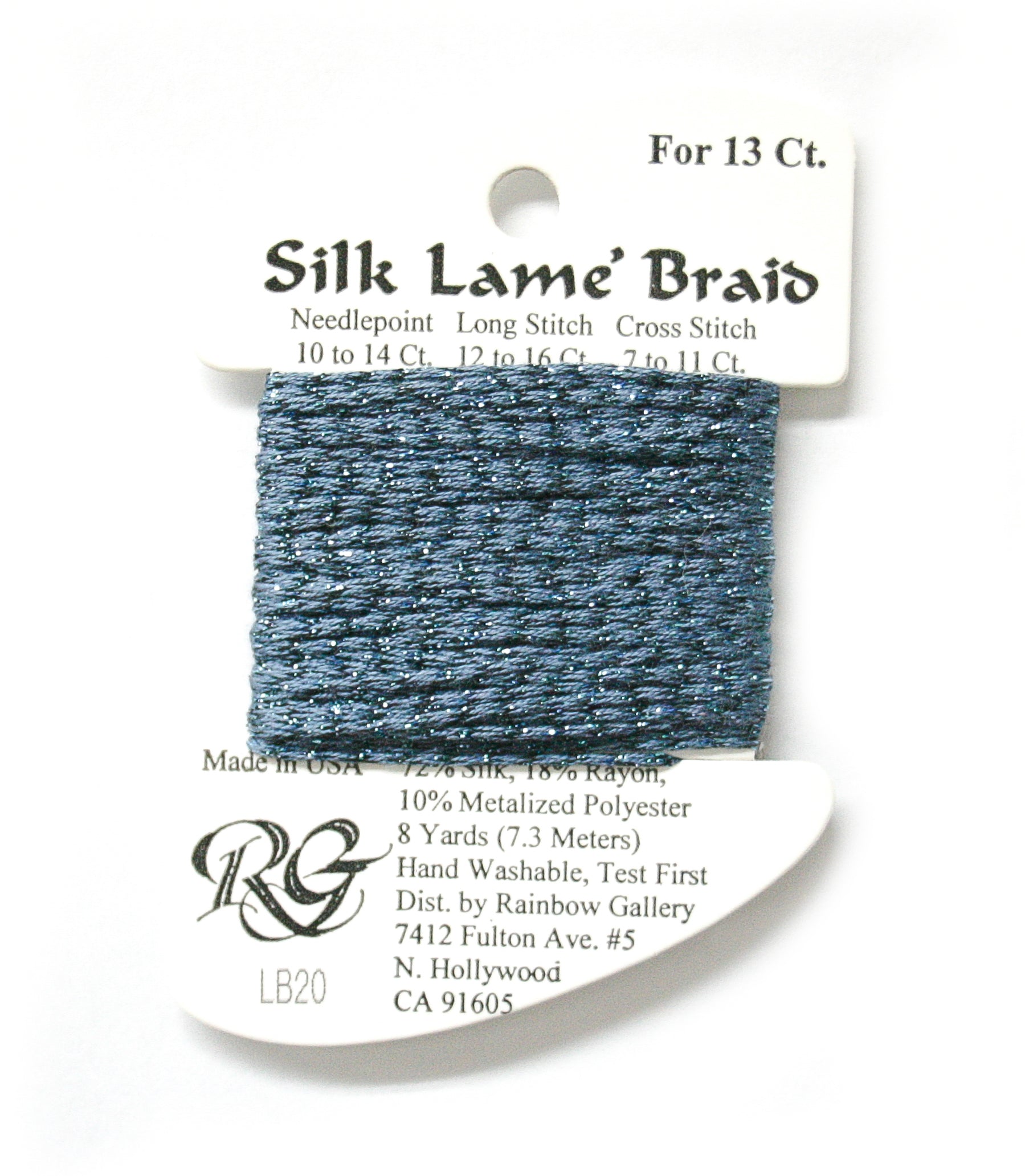 This is Silk Lame Braid 13 from Rainbow Gallery in color 020 Dark Antique Blue. A great thread for adding sparkle to 13 mesh projects. Use as-is on 13 mesh.