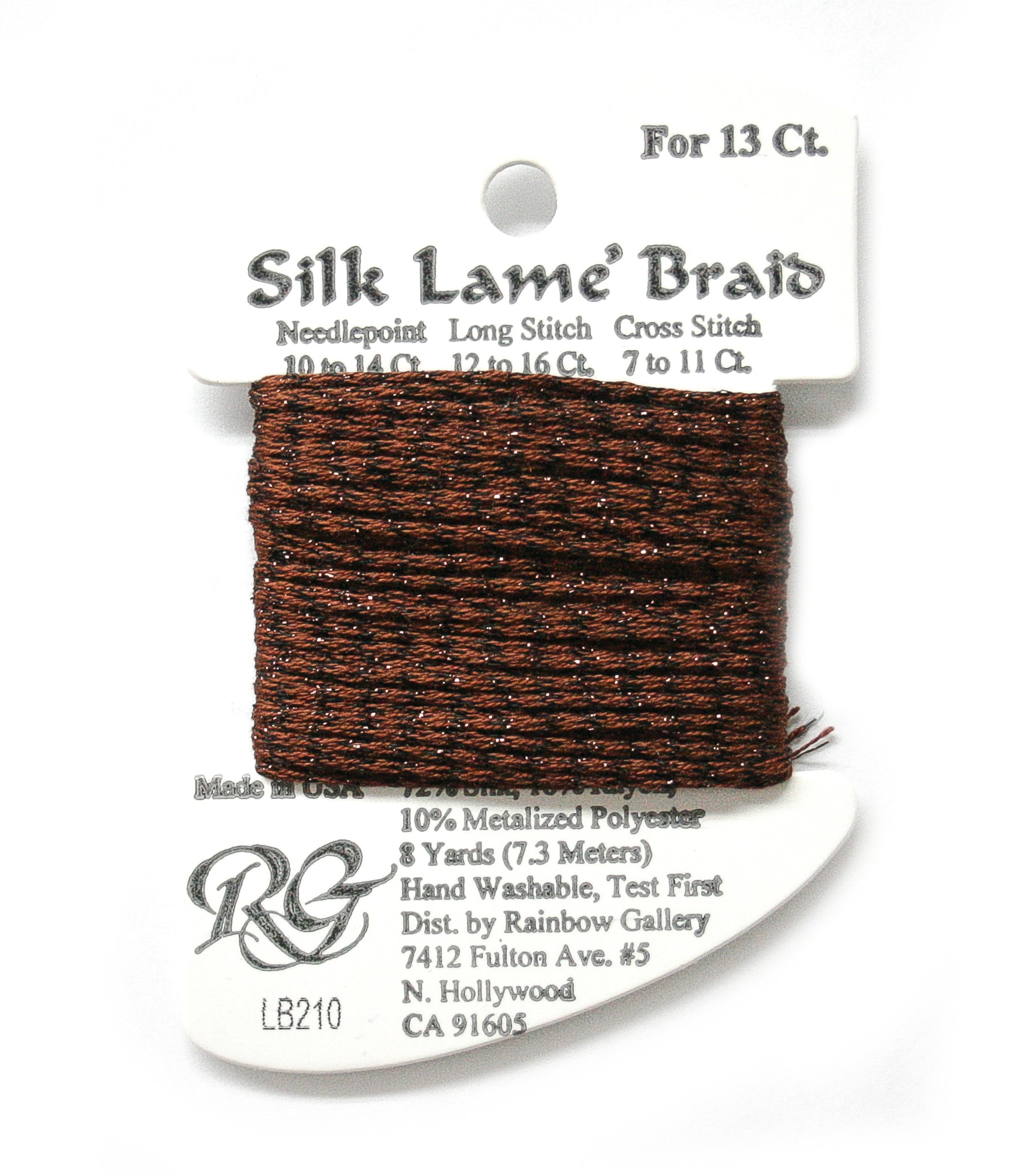 This is Silk Lame Braid 13 from Rainbow Gallery in color 210 Cappuccino. A great thread for adding sparkle to 13 mesh projects. Use as-is on 13 mesh.