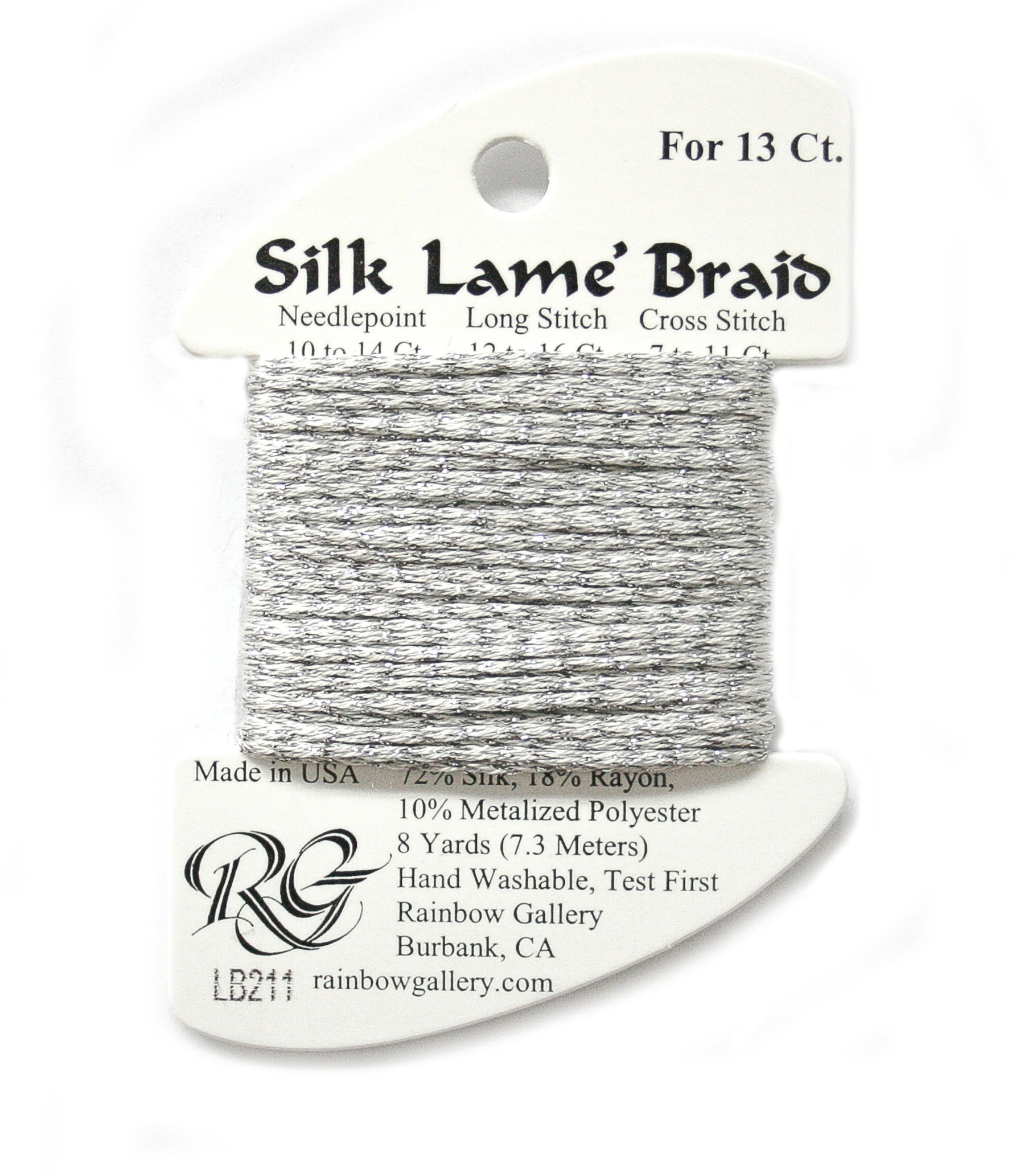 This is Silk Lame Braid 13 from Rainbow Gallery in color 211 Glacier Bay. A great thread for adding sparkle to 13 mesh projects. Use as-is on 13 mesh.