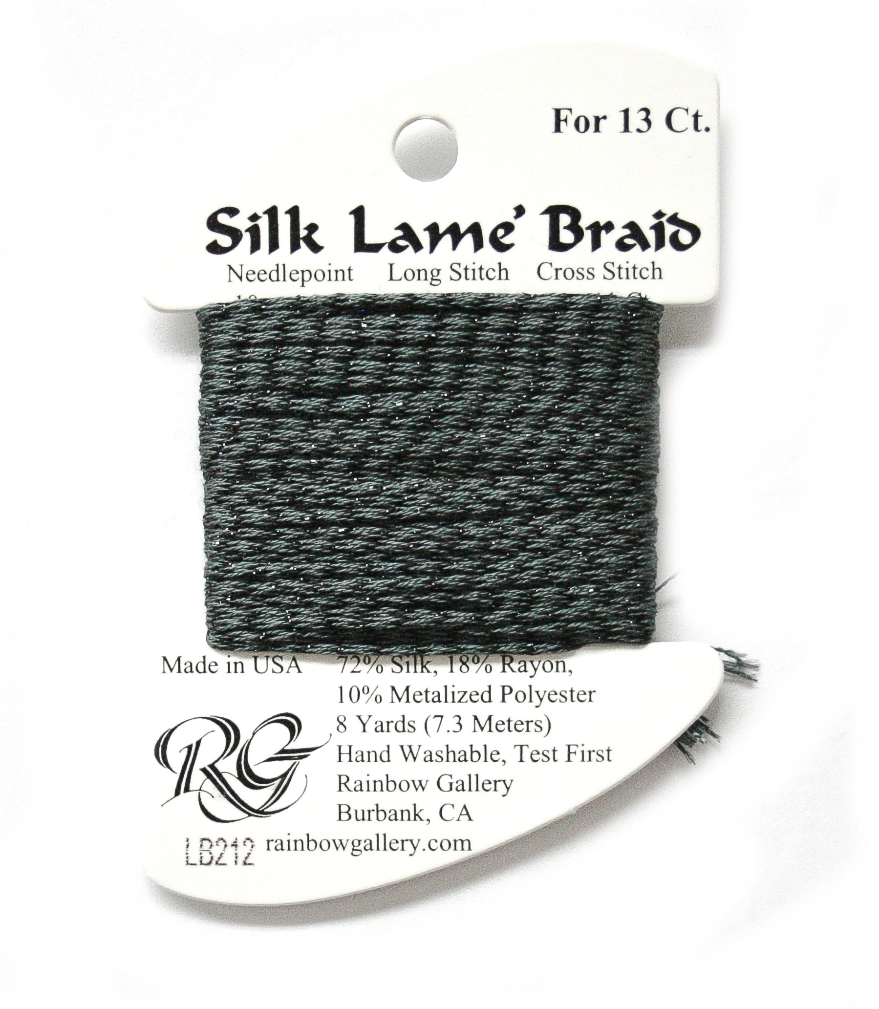 This is Silk Lame Braid 13 from Rainbow Gallery in color 212 Castlerock. A great thread for adding sparkle to 13 mesh projects. Use as-is on 13 mesh.