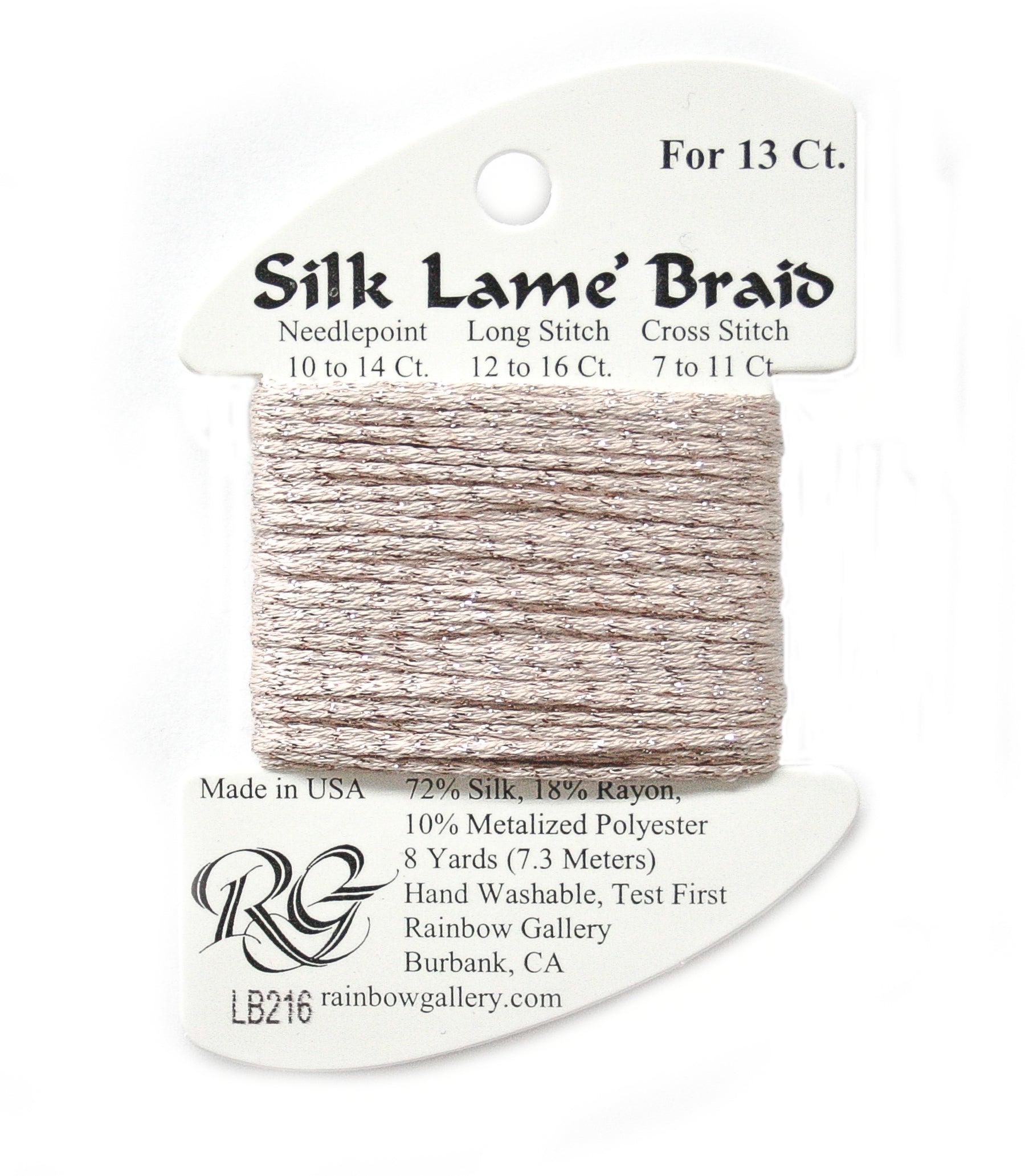 This is Silk Lame Braid 13 from Rainbow Gallery in color 216 Touch of Tan. A great thread for adding sparkle to 13 mesh projects. Use as-is on 13 mesh.