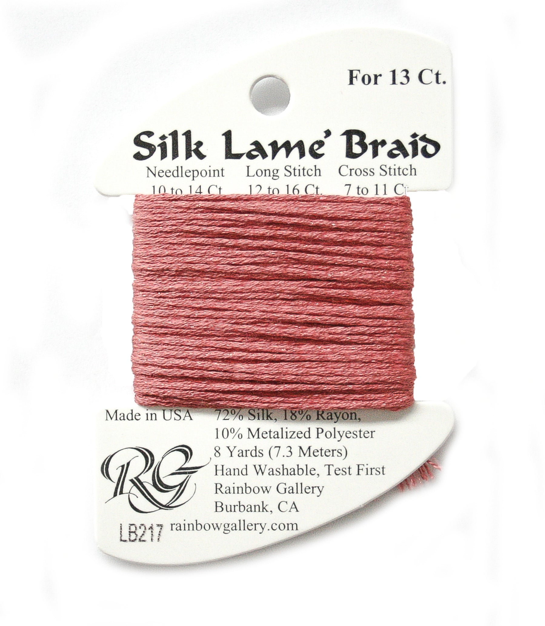 This is Silk Lame Braid 13 from Rainbow Gallery in color 217 Burnt Coral. A great thread for adding sparkle to 13 mesh projects. Use as-is on 13 mesh.